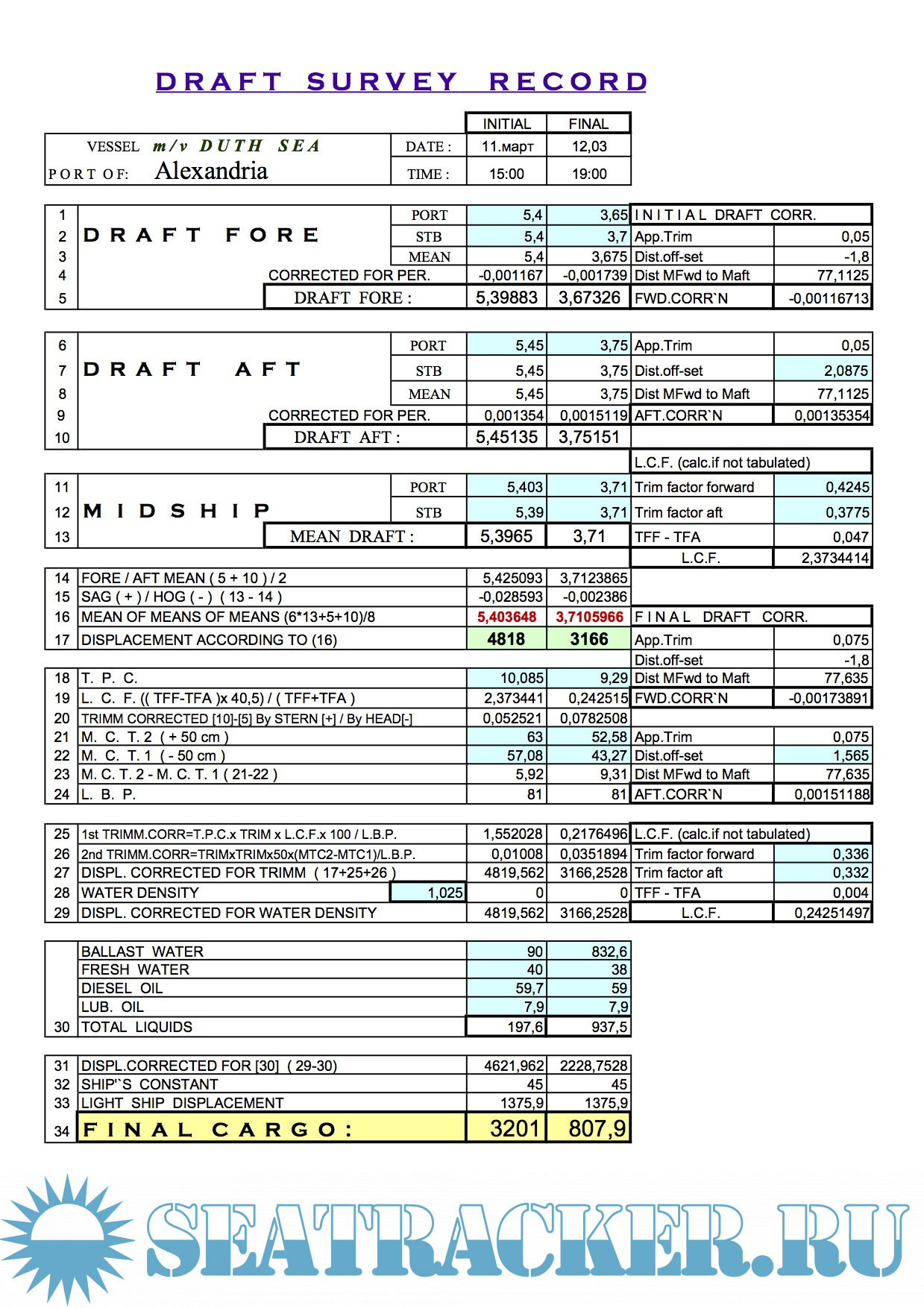 Draft Survey Calculations in MS Excel spreadsheets - Alexx [201x, XLS]