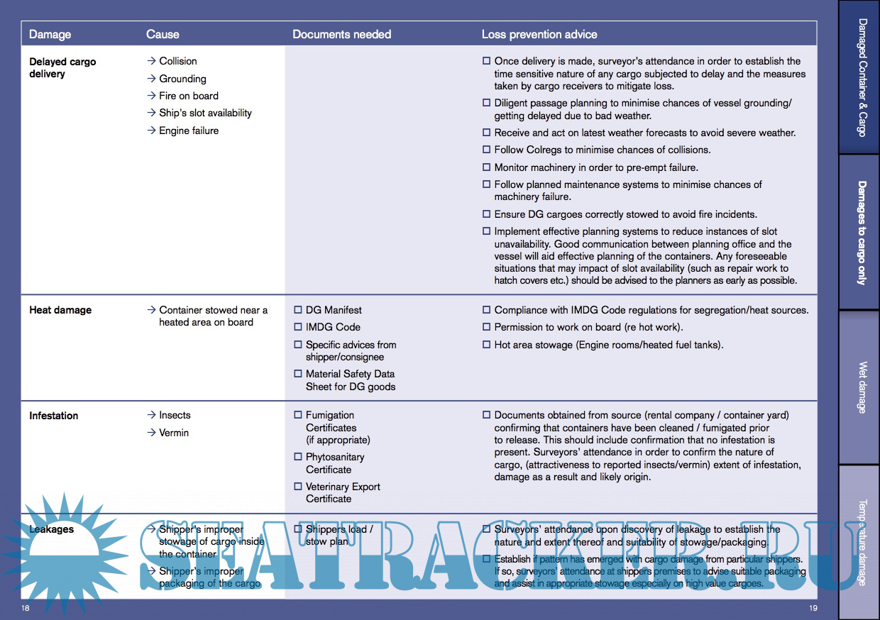 Year: 2017 Language: english Author: UK P&I Club Genre: Guide Publisher: UK P&I Club Format: PDF Quality: eBook Pages count: 23 Description: This booklet has been designed as a ready use tabbed reference book to be used by Ship’s crew and office-based operations staff as a training aid and assistance in the event of an incident. Following a review by the Club which identified the top 25 causes of claims in containers. The publication has been written in conjunction with TMC Marine Consultancy, a leading maritime consultancy with surveyors specialising in container stowage as well as Jensen Associates an independent expert consultancy and survey company, specialising in the international trade of perishable products.