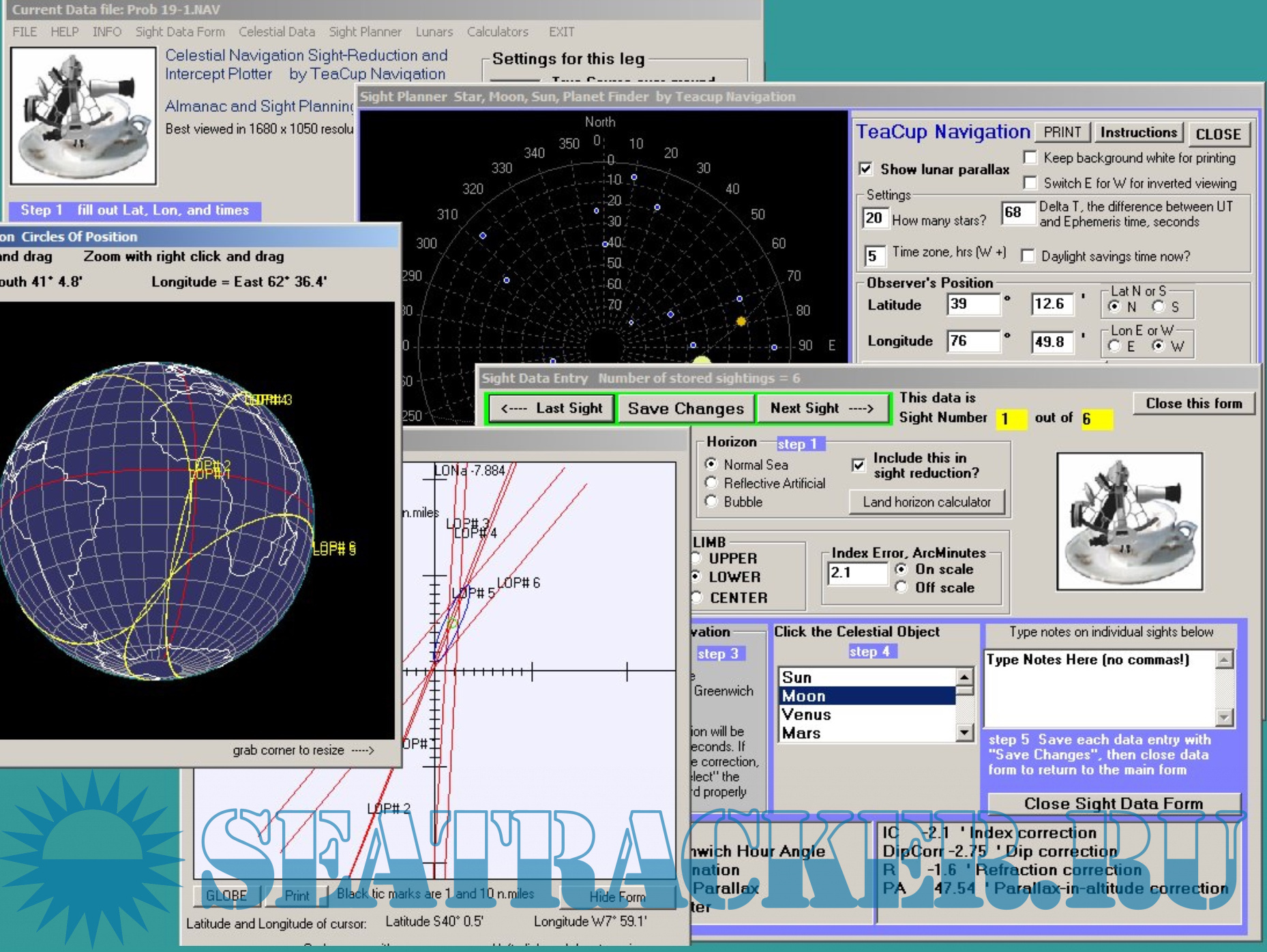 Year: 2014 Version: 3.2g Developer: Teacup Navigation Platform: Windows System Requirements: Windows XP and up Localization: english Crack: Not needed Description: TeacupCelestial, also called TeacupNav, from Teacup Navigation. Sight planning, built-in perpetual almanac, sight reduction with plotted LOPs and global COPs. Rise/set times, and Lunars are also part of this program along with many utility calculators.