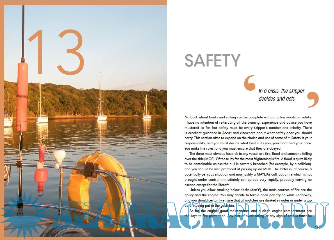 Topics covered include: choice of boat; insurance; assessing (and costing) moorings and berths; navigation and safety equipment; domestic equipment (galley, bedding, clothing, etc); navigation (including in fog); manuevering in close spaces; sources of weather information and forecasts; responsibilities towards crew; catering and cooking; maintenance advice (daily tips, winterizing, engine servicing, fitting out for spring, etc.); paperwork (including customs forms); dealing with emergencies; and more.