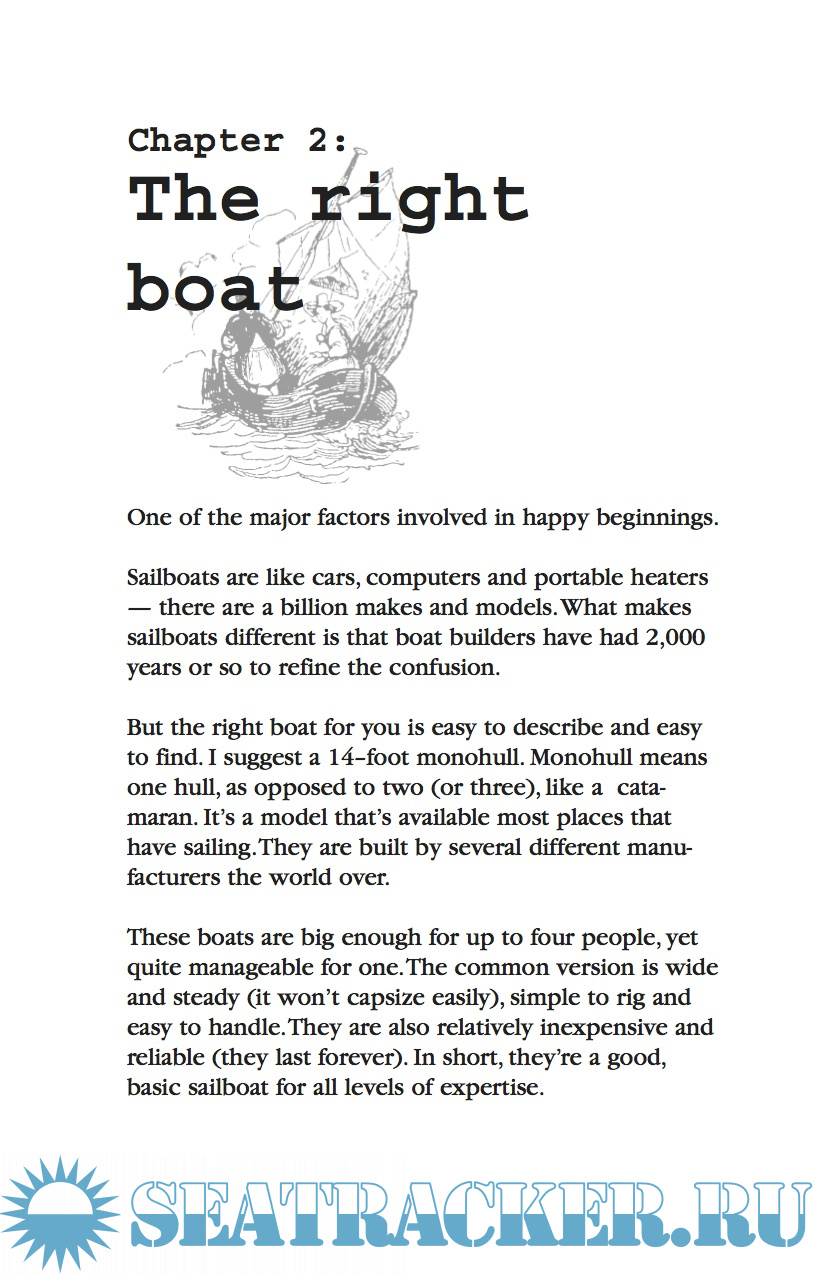 This book is about getting started and getting out there. Simple, straightforward. No long diatribes about theory. Skipping complicated sailing jargon that can stymie most novices, this book goes straight to the very basic questions, such as How do I leave the dock? and Where are the brakes?
