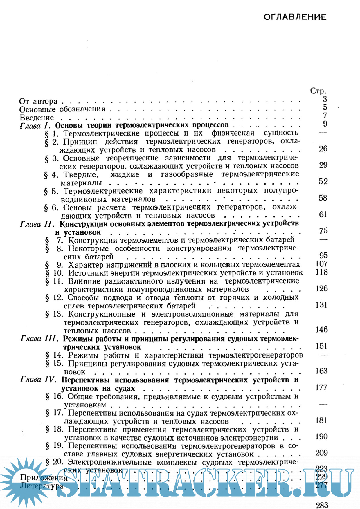 От автора Основные обозначения Введение Глава I. Основы теории термоэлектрических процессов § 1. Термоэлектрические процессы и их физическая сущность § 2. Принцип действия термоэлектрических генераторов, охлаждающих устройств и тепловых насосов. § 3. Основные теоретические зависимости для термоэлектрических генераторов, охлаждающих устройств и тепловых насосов § 4. Твердые, жидкие и газообразные термоэлектрические материалы § 5. Термоэлектрические характеристики некоторых полупроводниковых материалов § 6. Основы расчета термоэлектрических генераторов, охлаждающих устройств и тепловых насосов Глава II. Конструкции основных элементов термоэлектрических устройств и установок § 7. Конструкции термоэлементов и термоэлектрических батарей § 8. Некоторые особенности конструирования термоэлектрических батарей § 9. Характер напряжений в плоских и кольцевых термоэлементах § 10. Источники энергии термоэлектрических устройств и установок § 11. Влияние радиоактивного излучения на термоэлектрические характеристики полупроводниковых материалов § 12. Способы подвода и отвода теплоты от горячих и холодных спаев термоэлектрических батарей § 13. Конструкционные и электроизоляционные материалы для термоэлектрических генераторов, охлаждающих устройств и тепловых насосов Глава III. Режимы работы и принципы регулирования судовых термоэлектрических установок § 14. Режимы работы и характеристики термоэлектрогенераторов § 15. Принципы регулирования судовых термоэлектрических установок Глава IV. Перспективы использования термоэлектрических устройств и установок на судах § 16. Общие требования, предъявляемые к судовым устройствам и установкам § 17. Перспективы использования на судах термоэлектрических охлаждающих устройств и тепловых насосов § 18. Перспективы применения термоэлектрических устройств и установок в качестве судовых источников электроэнергии § 19. Перспективы использования термоэлектрогенераторов в составе главных судовых энергетических установок § 20. Электродвижительные комплексы судовых термоэлектрических установок Приложения Литература