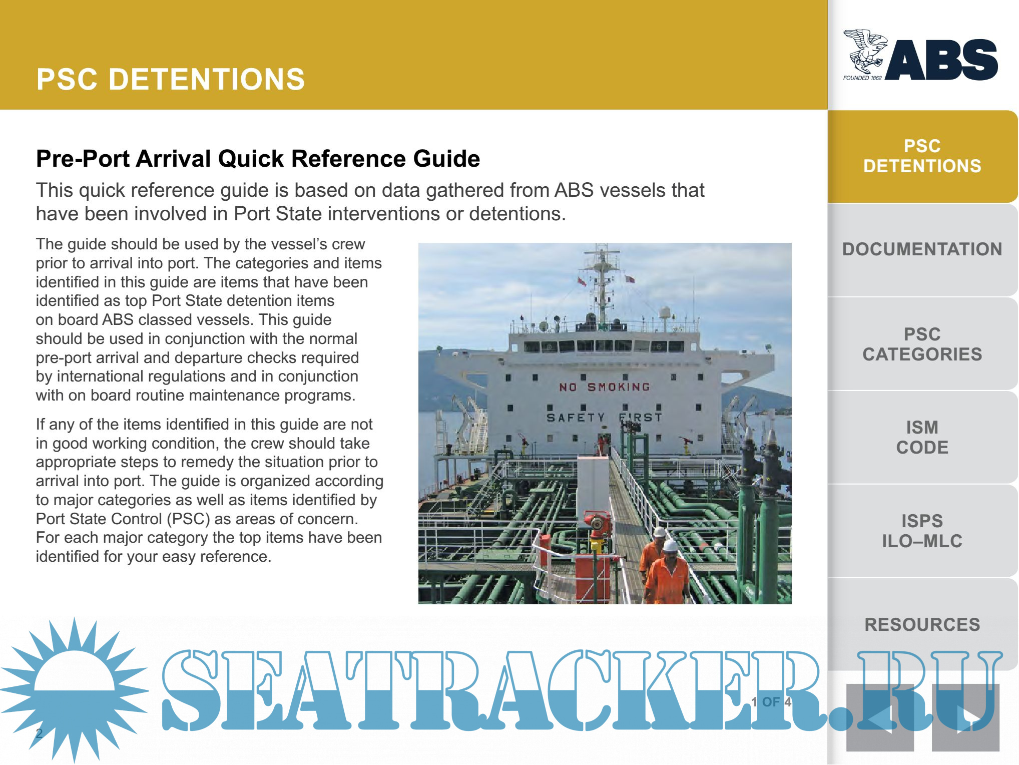 Description: This quick reference checklist guide is based on data gathered from ABS vessels that have been involved in Port State interventions or detentions. The guide should be used by the vessel’s crew prior to arrival into port. The categories and items identified in this guide are items that have been identified as top Port State detention items on board ABS classed vessels.