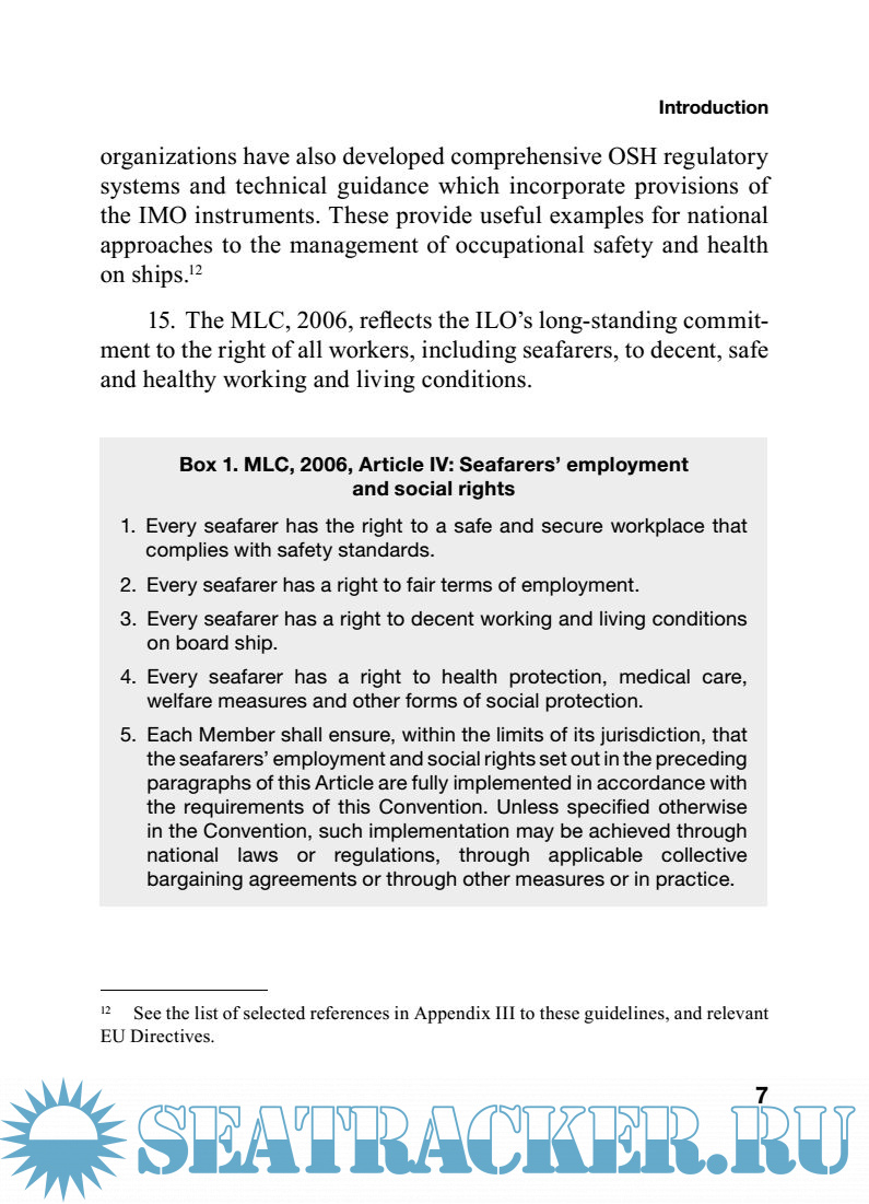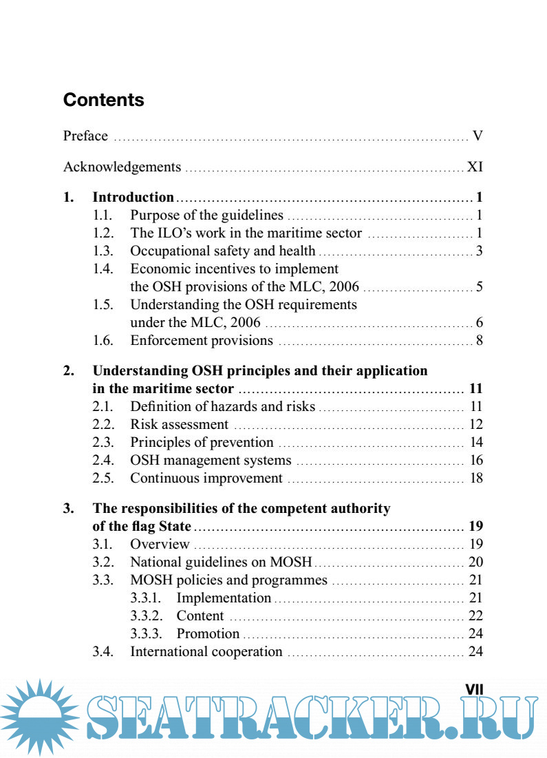 These Guidelines for implementing the occupational safety and health provisions of the Maritime Labour Convention, 2006, were adopted in October 2014 by a tripartite meeting of experts composed of experts from governments, shipowner organizations, and seafarer organizations and their advisers, as well as observers from governments and international organizations. The Governing Body of the ILO, at its March 2015 session, authorized their publication.