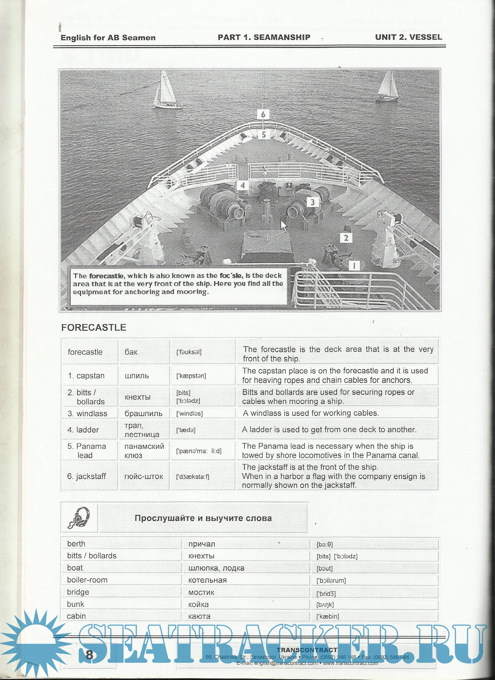 PART 1. SEAMANSHIP. UNIT 1 ЭКИПАЖ / CREW.UNIT 2 СУДНО / VESSEL.UNIT 3 ТИПЫ СУДОВ / TYPES OF VESSELS.UNIT 4 РАБОЧИЙ ДЕНЬ / WORKING DAY.UNIT 5 ГРУЗОВЫЕ УСТРОЙСТВА / CARGO GEARS.UNIT 6 КОМАНДЫ РУЛЕВОМУ / WHEEL ORDERS.UNIT 7 ШВАРТОВКА / MOORING.UNIT 8 УЗЛЫ / KNOTS.UNIT 9 БЕЗОПАСНОСТЬ / SAFETY.UNIT 10 ПОЛЕЗНЫЕ ФРАЗЫ / USEFUL PHRASES.PART 2. GRAMMAR. UNIT 1 ТРАНСКРИПЦИЯ, АЛФАВИТ / TRANSCRIPTION, ALPHABET.UNIT 2 ЧИСЛИТЕЛЬНЫЕ / NUMERALS.UNIT 3 МНОЖ. ЧИСЛО СУЩЕСТВИТЕЛЬНЫХ / PLURALS.UNIT 4 МЕСТОИМЕНИЯ / PRONOUNS.UNIT 5 ПРИТЯЖАТЕЛЬНЫЙ ПАДЕЖ / POSSESSIVE CASE.UNIT 6 ГЛАГОЛ TO BE, ОБОРОТЫ THERE IS/ARE.UNIT 7 НАСТОЯЩЕЕ ВРЕМЯ / PRESENT SIMPLE.UNIT 8 СТРАДАТЕЛЬНЫЙ ЗАЛОГ / PASSIVE VOICE.UNIT 9 НАСТОЯЩЕЕ ПРОДОЛЖЕННОЕ / PRESENT CONTINUOUS.UNIT 10 БУДУЩЕЕ ВРЕМЯ / FUTURE TENSE.UNIT 11 ПРОШЕДШЕЕ ВРЕМЯ / PAST SIMPLE TENSE.UNIT 12 МОДАЛЬНЫЕ ГЛАГОЛЫ / MODAL VERBS.APP. 1 ПОЛЕЗНЫЕ ГЛАГОЛЫ / USEFUL VERBS.Скриншоты