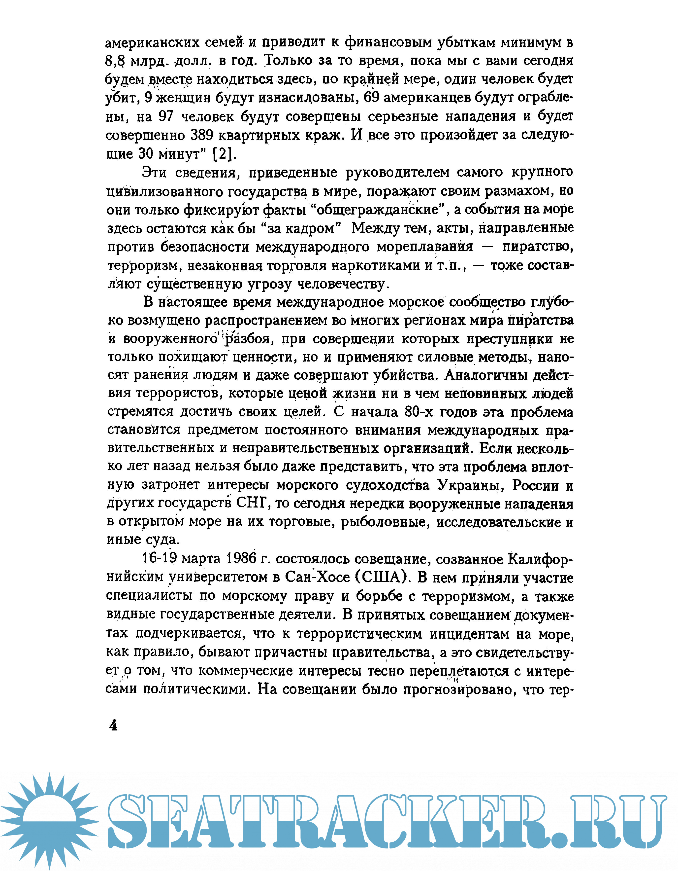 Год выпуска: 1997 Язык: Русский, Английский Автор: Демиденко В.В., Прусс В.М. и др. Жанр: Учебное пособие Издательство: АО БАХВА Издание: 2-е ISBN: 966-7079-13-9 Формат: DjVu Качество: Отсканированные страницы + слой распознанного текста Количество страниц: 139 Описание: В книге содержатся исторические сведения о развитии пиратства, терроризма, мошенничества на море и о борьбе с этими и другими незаконными актами, направленными против безопасности мореплавания. Для курсантов, студентов морских и юридических учебных заведений, командного состава морских судов, работников эксплуатационных служб судовладельческих организаций, профессорско-преподавательского состава и научных работников, представляет интерес для всех, кто связан с торговым мореплаванием. Печатается по решению Ученого совета Одесской государственной морской академии.