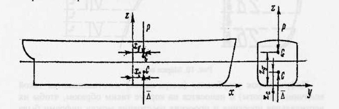 Ось x – след пересечения ДП с ОП: она направлена вдоль судна в нос с началом отсчета на миделе.