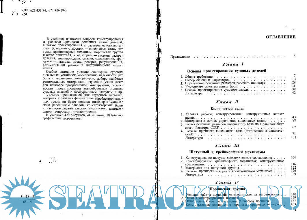 Особое внимание уделено специфике судовых дизельных установок, обеспечению надежности работы и увеличению моторесурса, выбору наиболее рациональных материалов, изучению узлов дизелей наиболее прогрессивной конструкции, особенностям проектирования малооборотных мощных судовых дизелей с газотурбинным наддувом и др.