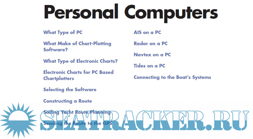 1 The Global Positioning System 2 Our Address on the Earth’s Surface 3 The Magnetic Compass 4 Constructing a Route 5 Tides 6 Boat Speed 7 Depth Sounders 8 Finding Position 9 Passage Planning 10 Pilotage 11 Automatic Identifi cation System 12 Radar 13 Autopilots 14 Personal Computers