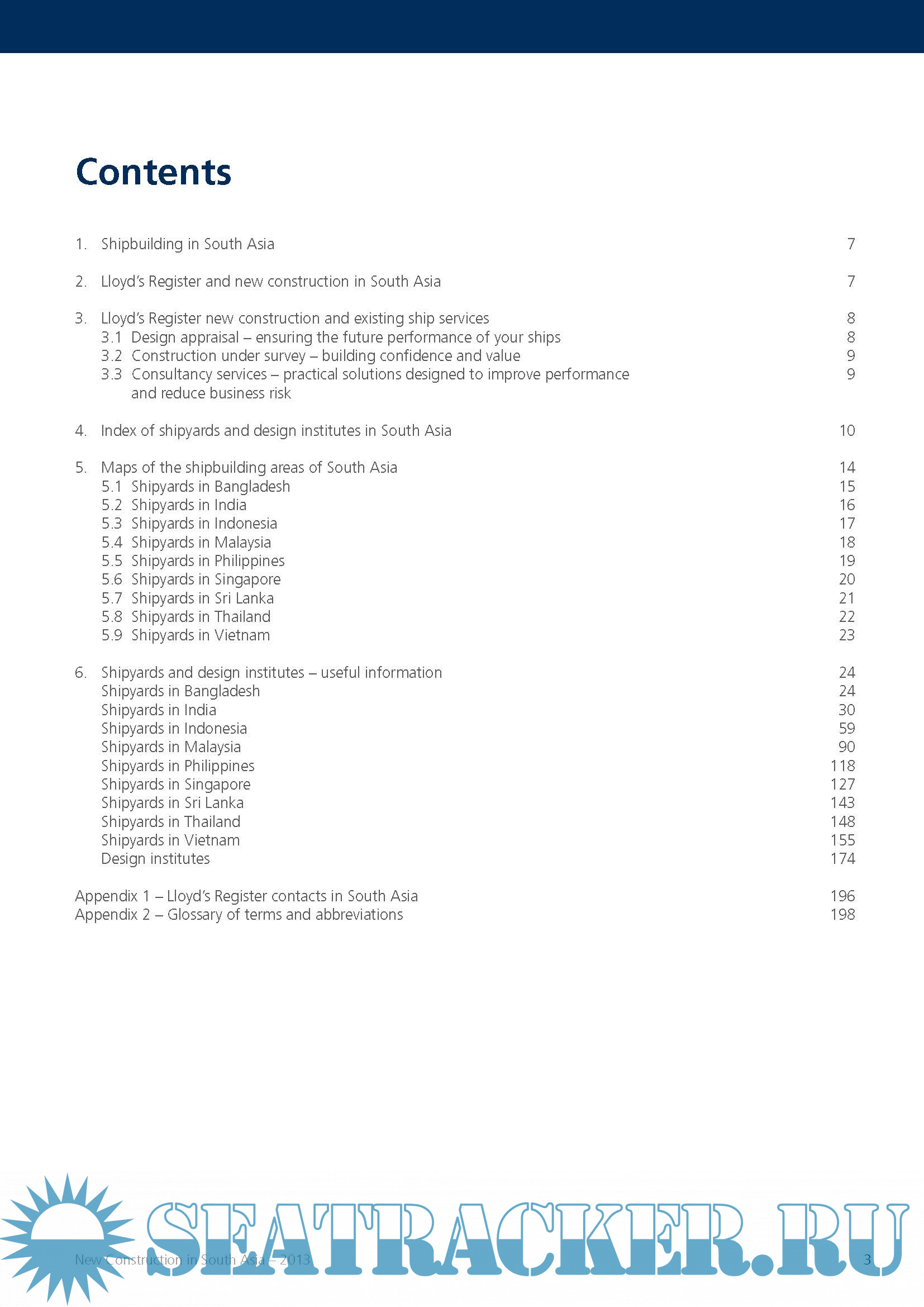 1. Shipbuilding in South Asia 2. Lloyd’s Register and new construction in South Asia 3. Lloyd’s Register new construction and existing ship services 3.1 Design appraisal – ensuring the future performance of your ships 3.2 Construction under survey – building confidence and value 3.3 Consultancy services – practical solutions designed to improve performance and reduce business risk 4. Index of shipyards and design institutes in South Asia 5. Maps of the shipbuilding areas of South Asia 5.1 Shipyards in Bangladesh 5.2 Shipyards in India 5.3 Shipyards in Indonesia 5.4 Shipyards in Malaysia 5.5 Shipyards in Philippines 5.6 Shipyards in Singapore 5.7 Shipyards in Sri Lanka 5.8 Shipyards in Thailand 5.9 Shipyards in Vietnam 6. Shipyards and design institutes – useful information Shipyards in Bangladesh Shipyards in India Shipyards in Indonesia Shipyards in Malaysia Shipyards in Philippines Shipyards in Singapore Shipyards in Sri Lanka Shipyards in Thailand Shipyards in Vietnam Design institutes Appendix 1 – Lloyd’s Register contacts in South Asia Appendix 2 – Glossary of terms and abbreviations