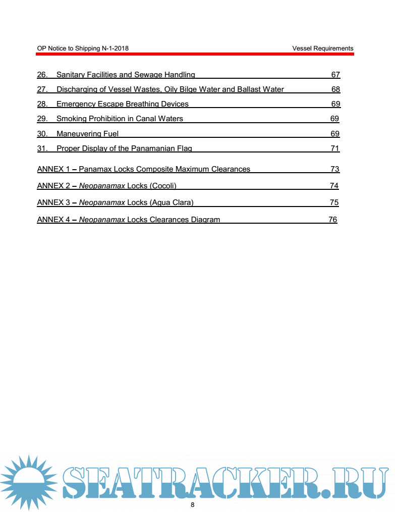 1.Definitions 2. Size and Draft Limitations of Vessels a. Vessels Transiting the Panamax Locks b. Vessels Transiting the Neopanamax Locks c. Other Draft Considerations d. Maximum Width e. Protrusions f. Maximum Height g. Release from Liability h. Approval of Plans i. Required Documentation for Initial Transit in Electronic Format j. Denial of Transit k. Vessel Should Be Able to Relay at the Locks 3. Requirement for Pilot Platforms and Shelters on Certain Vessels 4. Navigation Bridge Features Required of Transiting Vessels a. Authority b. Wheelhouse c. Bridge Wings d. Normal Conning Positions e. Panama Canal Minimum Visibility Requirements f. Indicators g. Very High Frequency (VHF) Radio h. Whistle Controls i. Steering Light j. Bow/Stern Thrusters k. Compass l. Course Recorders m. Bridge Wing Spotlights n. Radar o. Main Propulsion Systems p. Use of Automatic Identification System (AIS) q. Steering gear 5. Requirements for Non-Self-Propelled Vessels 6 Vessels Requiring Towing Services 7. Deck Load Cargo 8 Construction, Number and Location of Chocks and Bitts a. Vessels Transiting the Panamax Locks b. Neopanamax and Panamax Plus Vessels 9. Mooring Lines, Anchors and Deck Machinery 10. Boarding Facilities 11. Definitive Phase-out of Single Hull Oil Tankers 12. Admeasurement System for Full Container Vessels 13. Deck-Loaded Containers on Ships not Built for Container Carriage a. General b. Approval for Transits c. Advance Notice and Inspection 14. Unauthorized Modification to the ACP/TOLL BASIS Certificate 15. Calculation of PC/UMS Net Tonnage on Passenger Vessels 16. Dangerous Cargo Requirements a. General b. Test of Equipment on Board c. Holding Due to Non-Compliance d. Reporting Dangerous Cargo in Bulk e. Tankers Claiming Cargo Tanks as “Gas Free” or “Inert” f. Reporting Shipments of Direct Reduced Iron g. Precautionary Measures Due to Dangerous Cargo h. Reporting Shipments of Hazardous Wastes i. Reporting Radioactive Cargo j. Coverage Requirements for Transiting Vessels Carrying Radioactive Cargo k. Advance Notification of Shipments of Fissionable Materials l. Tanker Inspection Program 17. Cargo Regulated Under Annex II of MARPOL 18. Pre-Arrival Cargo Declarations, Security Inspection and Escort 19. Hot Work Performed On Board Vessels 20. Manning Requirements 21. Additional Pilots Due to Vessel Deficiencies 22 Pilot Accommodations On Board Transiting Vessels 23. Air Conditioning Systems on Transiting Vessels 24. Main Source of Electrical Power 25. Emergency Source of Electrical Power 26. Sanitary Facilities and Sewage Handling 27. Discharging of Vessel Wastes, Oily Bilge Water and Ballast Water 28. Emergency Escape Breathing Devices 29. Smoking Prohibition in Canal Waters 30. Maneuvering Fuel 31. Proper Display of the Panamanian Flag ANNEX 1 – Panamax Locks Composite Maximum Clearances ANNEX 2 – Neopanamax Locks (Cocoli) ANNEX 3 – Neopanamax Locks (Agua Clara) ANNEX 4 – Neopanamax Locks Clearances Diagram