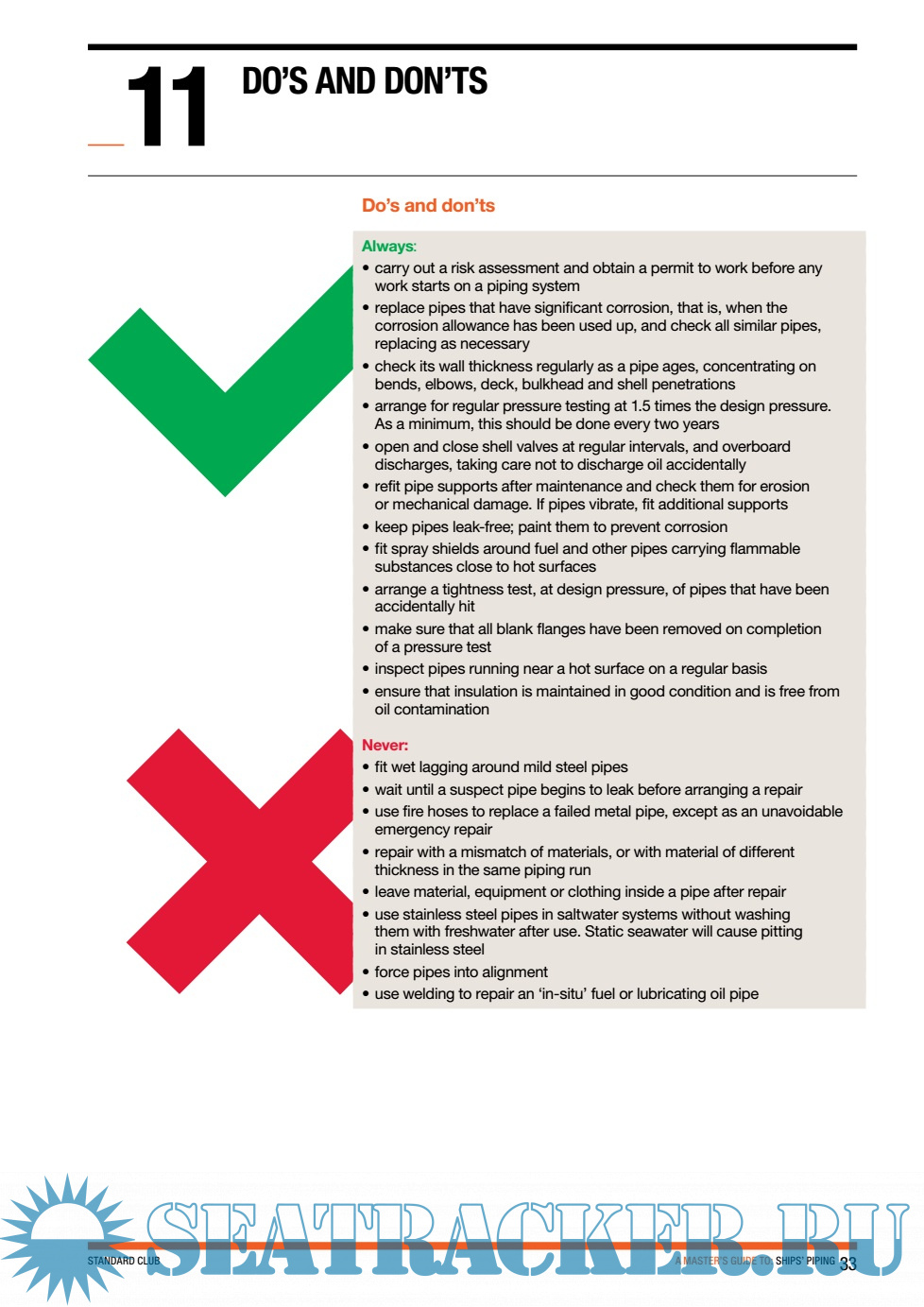 Introduction Pipes and P&I claims Basic information Pipes and ship classification societies Ships’ piping systems Pipe design Causes of pipe failure Dealing with pipe failure Pipe maintenance Pipe repair Do’s and Don’ts Appendix I – Mechanical joints in common use Appendix II – Pressure test procedure