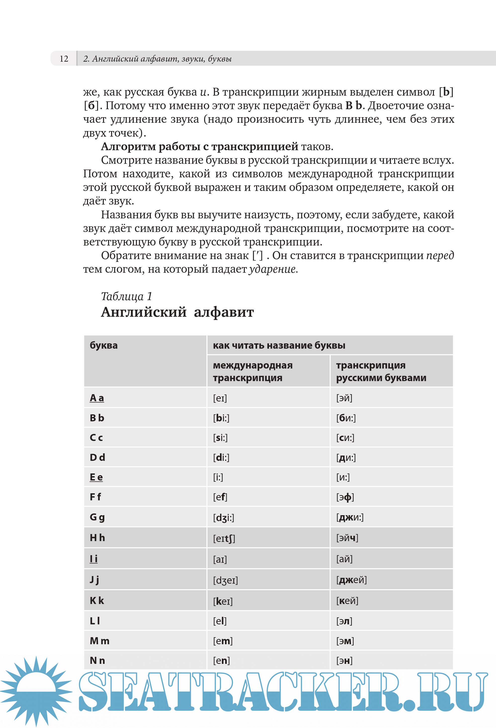Введение 3 1. Почему вы сможете 4 2. Английский алфавит, звуки, буквы 9 3. Произношение звуков, на которое стоит обратить внимание 14 4. Как запомнить алфавит и что угодно и преодолеть психологические барьеры 16 5. Классификация звуков и букв 17 6. Чтение согласных 18 7. Как получить прочные знания и навыки 27 8. Типы чтения гласных 29 9. Чтение гласных в буквосочетаниях 33 10. Как запомнить правила чтения и вообще иметь высокий уровень грамотности в любом языке 37 11. Временные формы 38 12. Состав временных форм 40 13. Построение вопросительных предложений 43 13.1. Идея построения вопроса 43 13.2. Общие вопросы во временах группы Indefinite 52 13.3. Принцип расположения обстоятельств времени 61 13.4. Шпаргалки по формам смысловых и вспомогательных глаголов 63 13.5. Общие вопросы в Present Continuous 66 13.6. Понятие об артикле 68 13.7. Общие вопросы в Past Continuous 70 13.8. Принцип формирования вспомогательного глагола в комбинированных временных формах 74 13.9. Общие вопросы в Future Continuous 78 13.10. Общие вопросы в Present Perfect 81 13.11. Особенности чтения окончания ed 84 13.12. Особенности правописания глаголов с окончанием ed 85 13.13. Общие вопросы в Past Perfect 85 13.14. Объектный падеж местоимений 87 13.15. Общие вопросы в Future Perfect 89 13.16. Аналогии в обстоятельствах времени 93 13.17. Аналогия построения вопросов в различных временных формах с одним и двумя вспомогательными глаголами 94 14. Построение отрицательных предложений 100 14.1. Как строить отрицательные предложения 100 14.2. Задания на построение отрицательных предложений 105 14.3. Сокращённые формы сочетаний вспомогательных глаголов с частицей not 115 14.4. Сокращённые формы вспомогательных глаголов 117 15. Построение утвердительных предложений 118 15.1. Отличие утвердительного предложения от вопросительного 118 15.2. Получение из утвердительного предложения вопросительного 122 15.3. Отличие утвердительного предложения от отрицательного 123 16. Нюансы употребления артиклей 131 17. Сильные глаголы 132 17.1. Глагол be как сильный глагол 134 17.2. Модальные глаголы 137 18. Повелительные предложения 148 Наши результаты 151 Грамматический справочник 152 Имена собственные 153 Словарь 154