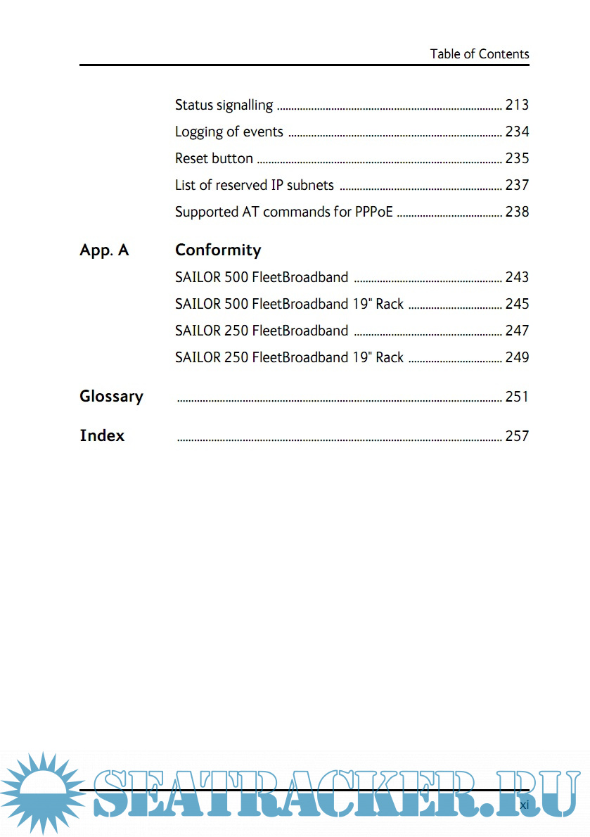 Year: 2013 Language: english Author: Thrane & Thrane A/S Genre: Manual Publisher: Thrane & Thrane A/S Format: PDF Quality: eBook Pages count: 278 Description: SAILOR 500 FleetBroadband and SAILOR 250 FleetBroadband are maritime broadband systems, providing simultaneous high-speed data and voice communication via satellite through the BGAN (Broadband Global Area Network). Features and interfaces The SAILOR FleetBroadband System offers the following features and interfaces: Simultaneous voice and data communication over BGAN Full duplex, single or multi-user, up to: SAILOR 500 FleetBroadband: 492 kbps SAILOR 250 FleetBroadband: 284 kbps Support for streaming IP at: SAILOR 500 FleetBroadband: 8, 16, 32, 64, 128 and 256 kbps SAILOR 250 FleetBroadband: 8, 16, 32, 64 and 128 kbps ISDN (Integrated Services Digital Network) service, only SAILOR 500 FleetBroadband: 64 kbps Voice: Standard Voice (4 kbps) or 3.1 kHz Audio Optional Multi-voice feature: up to 9 concurrent voice calls (max. 6 for SAILOR 250 FleetBroadband) Optional Voice Distress feature 4 LAN (Local Area Network) ports with PoE (Power over Ethernet) for computers, e-hubs, IP handsets etc. 2 Standard Phone/Fax ports for standard phones or fax machines 1 Euro ISDN port for ISDN phones or, for SAILOR 500 FleetBroadband only: G4 fax or ISDN modem 1 L-Band output for connecting a broadcast receiver for maritime data 1 multi-purpose I/O connector with 5 configurable inputs/outputs 1 SIM slot for your BGAN SIM card Built-in DHCP/NAT router Built-in web interface allowing you to manage your phone book, messages and calls, and customize the terminal to your specific needs Input power: 10.5 - 32 V DC (14 A - 5.5 A) CE certified ATC resilient Supports Inmarsat’s extended L-band services, Inmarsat-XL