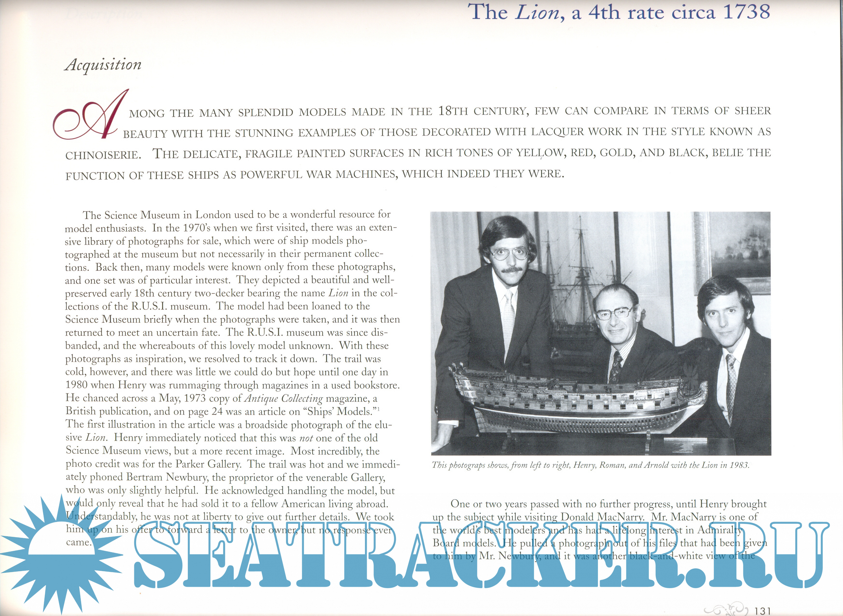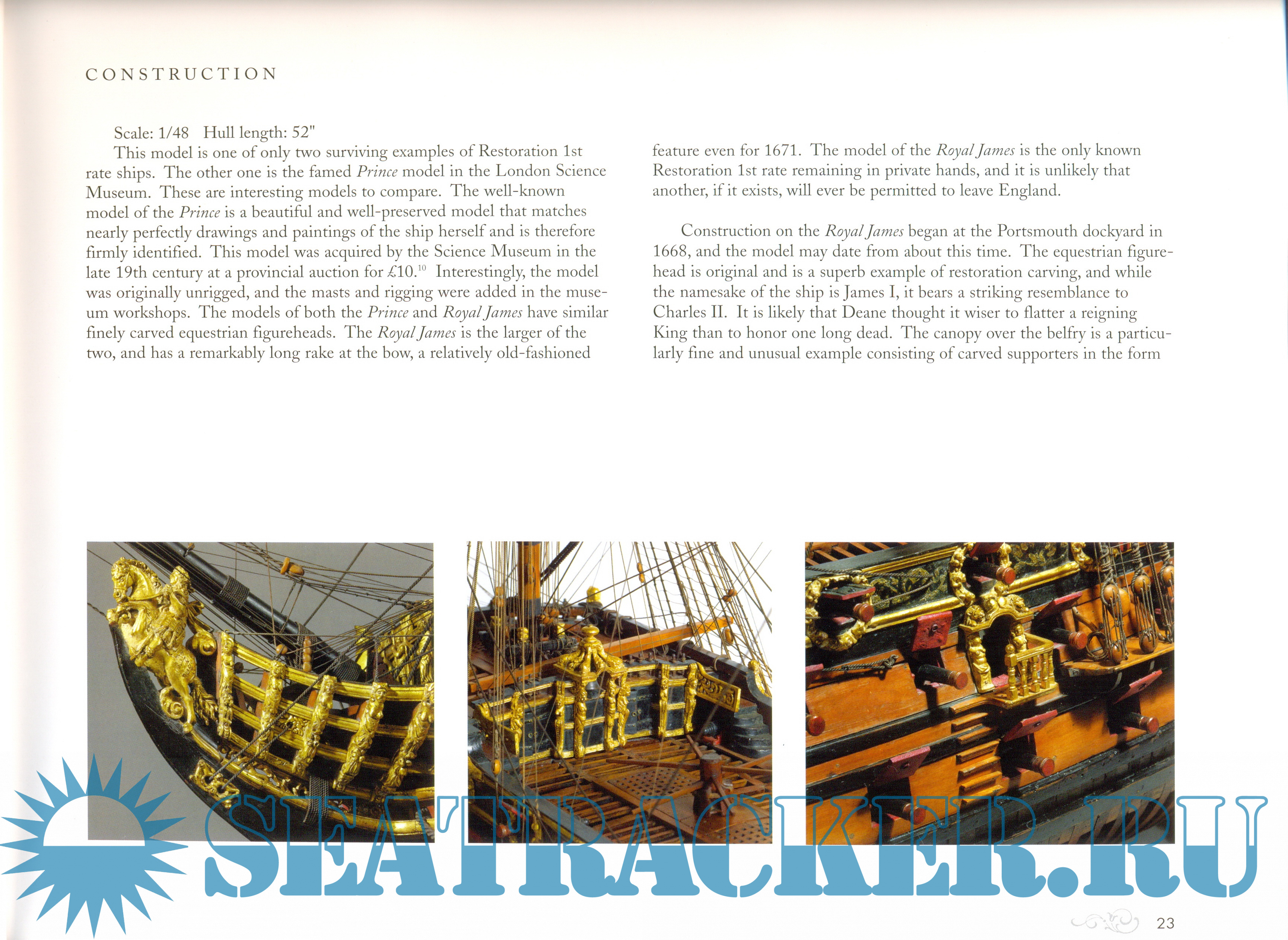 Description: Самая большая в мире частная коллекция английских адмиралтейских моделей парусных кораблей принадлежит американской семье Кригштайн. Она была собрана совместными усилиями Романа Кригштайна и его сыновей-близнецов Арнольда и Генри. При сборе коллекции Кригшатйнами было принято решение сконцентрироваться на промежутке 1650-1750 гг., когда строительство моделей в Англии начало развиваться бурными темпами. Важно знать, что коллекция состоит исключительно из моделей, сделанных в XVII-XVIII веках, т.е. это не новоделы, а модели-современники своих прототипов. В тех случаях, когда удается проследить судьбу модели вплоть до ее первого владельца на момент постройки модели, им оказывается действительный член английского адмиралтейств-совета. Поэтому модели парусников коллекции Кригштайн можно считать образцом исторической достоверности. Именно эту коллекцию и ее фотографии можно приводить в качестве неоспоримого аргумента в пользу выбора того или иного решения при изготовлении модели корабля указанного периода.