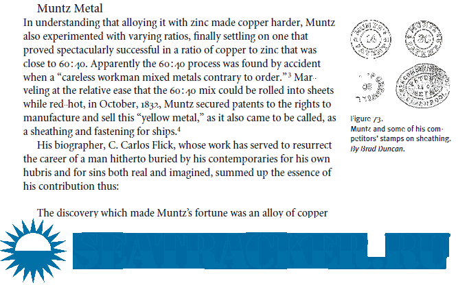 McCarthy is superb covering hull‐sheathing, patented Muntz metal, and iron and steel ships and the development of rivets, forelock‐bolts, threaded bolts, nails and dumps.