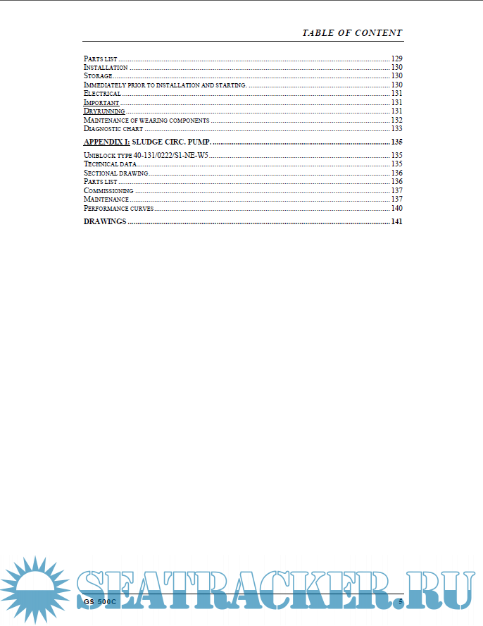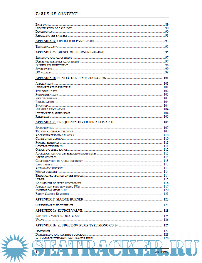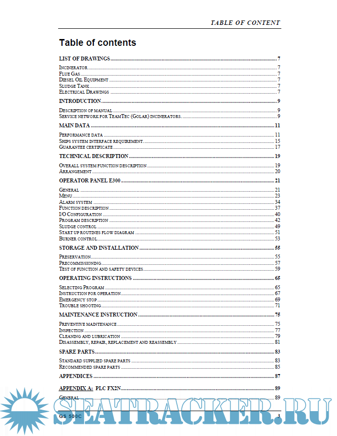 List of drawings Introduction Main data Technical description Operator panel MAC E300 Storage and installation Operating instructions Maintenance instruction Spare parts Appendices Drawings