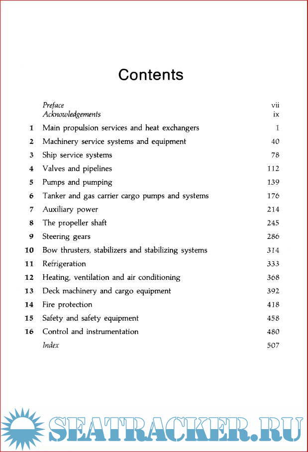 (Chapter No.) / (Topic) / (Page No.) 1 Main propulsion services and heat exchangers 1 2 Machinery service systems and equipment 40 3 Ship service systems 78 4 Valves and pipelines 112 5 Pumps and pumping 139 6 Tanker and gas carrier cargo pumps and systems 176 7 Auxiliary power 214 8 The propeller shaft 245 9 Steering gears 286 10 Bow thrasters, stabilizers and stabilizing systems 314 11 Refrigeration 333 12 Heating, ventilation and air conditioning 368 13 Deck machinery and cargo equipment 392 14 Fire protection 418 15 Safety and safety equipment 458 16 Control and Instumentation 507