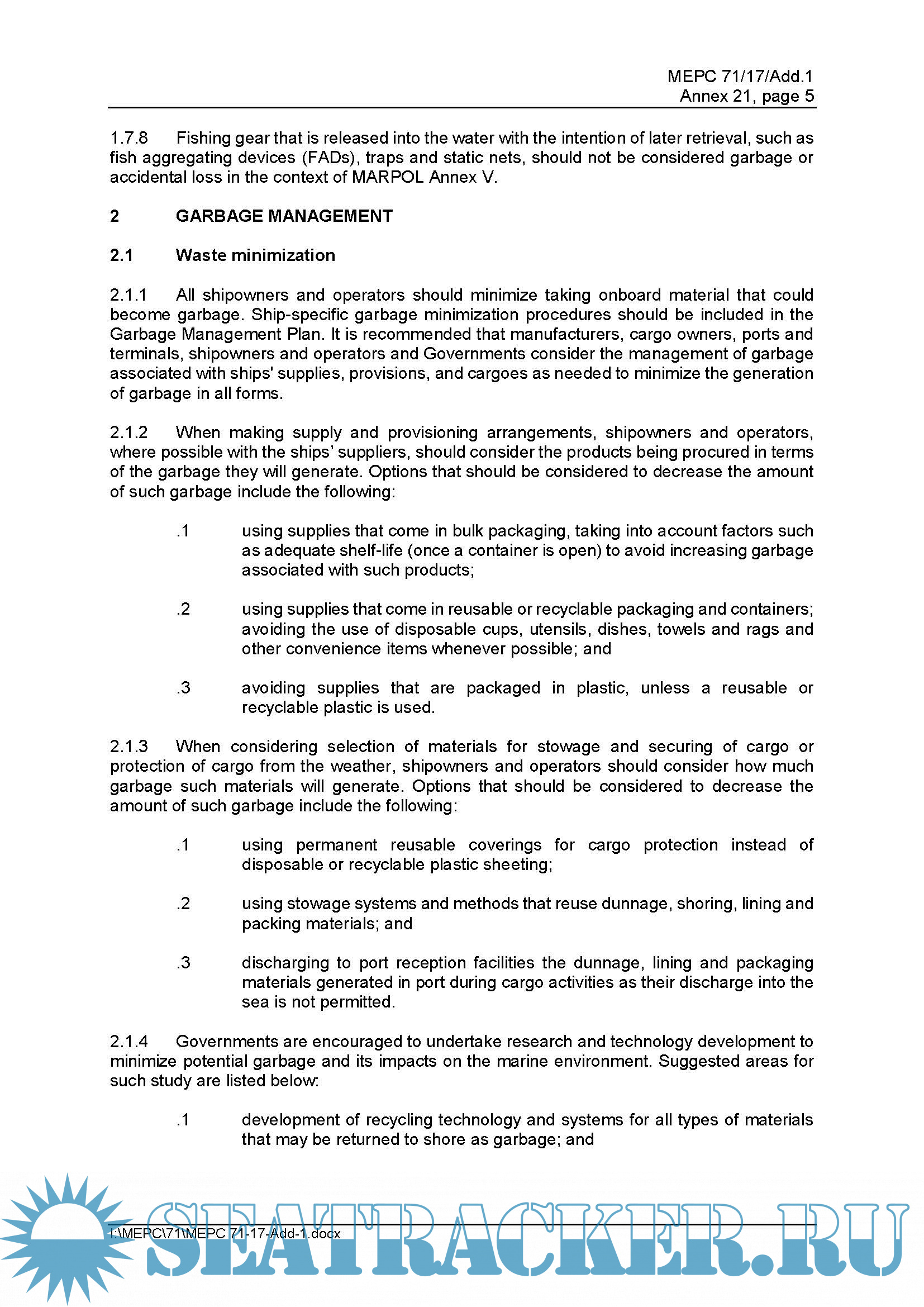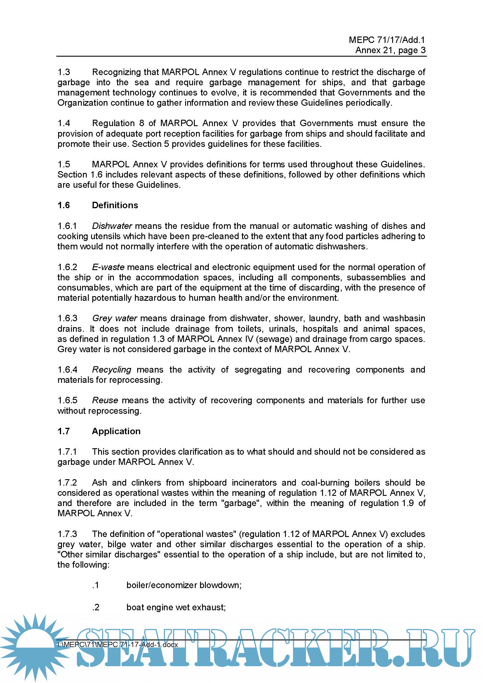 Description: The revised MARPOL Annex V, which entered into force on 1 January 2013, prohibits the discharge of all types of garbage into the sea unless explicitly permitted under the Annex. These Guidelines have been developed taking into account the regulations set forth in MARPOL Annex V.