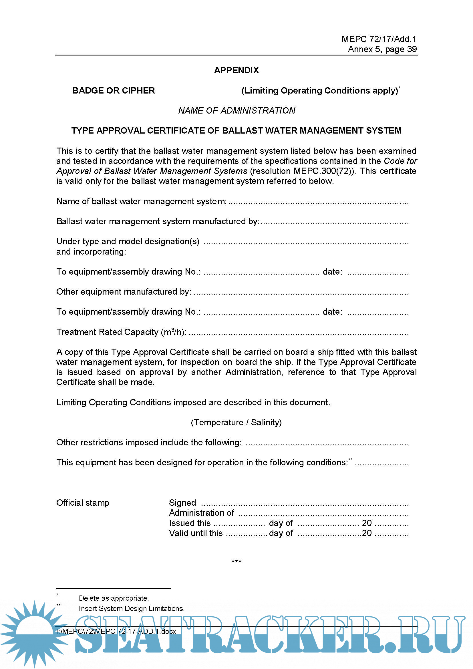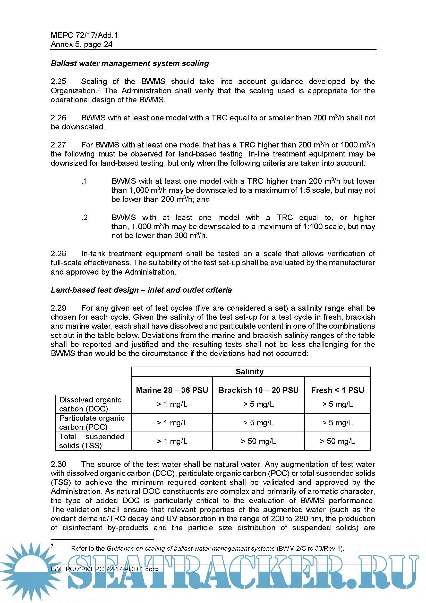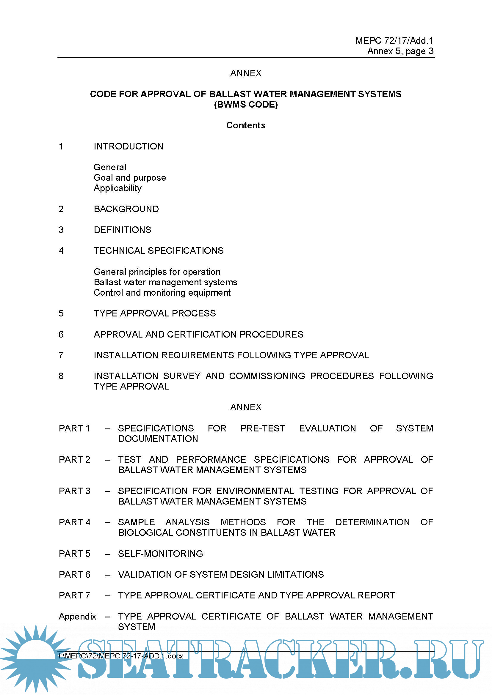 Description: The Code for Approval of Ballast Water Management Systems (BWMS Code) is aimed primarily at Administrations, or their designated bodies, in order to assess whether ballast water management systems (BWMS) meet the standard set out in regulation D-2 of the International Convention for the Control and Management of Ships' Ballast Water and Sediments, 2004 (the Convention). In addition, the Code is intended for manufacturers and shipowners as a reference on the evaluation procedure that equipment will undergo and the requirements placed on BWMS. The Code should be applied in an objective, consistent and transparent way and its application should be evaluated periodically by the Organization.