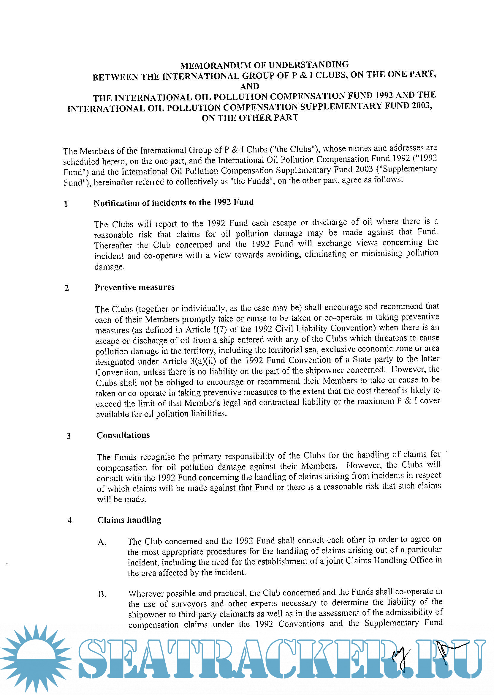 Memorandum Of Understanding between the International Group of P & I clubs, on the one part, and the International Oil Pollution Compensation Fund 1992 and the International Oil Pollution Compensation Supplementary Fund 2003, on the other part (8 Pages).