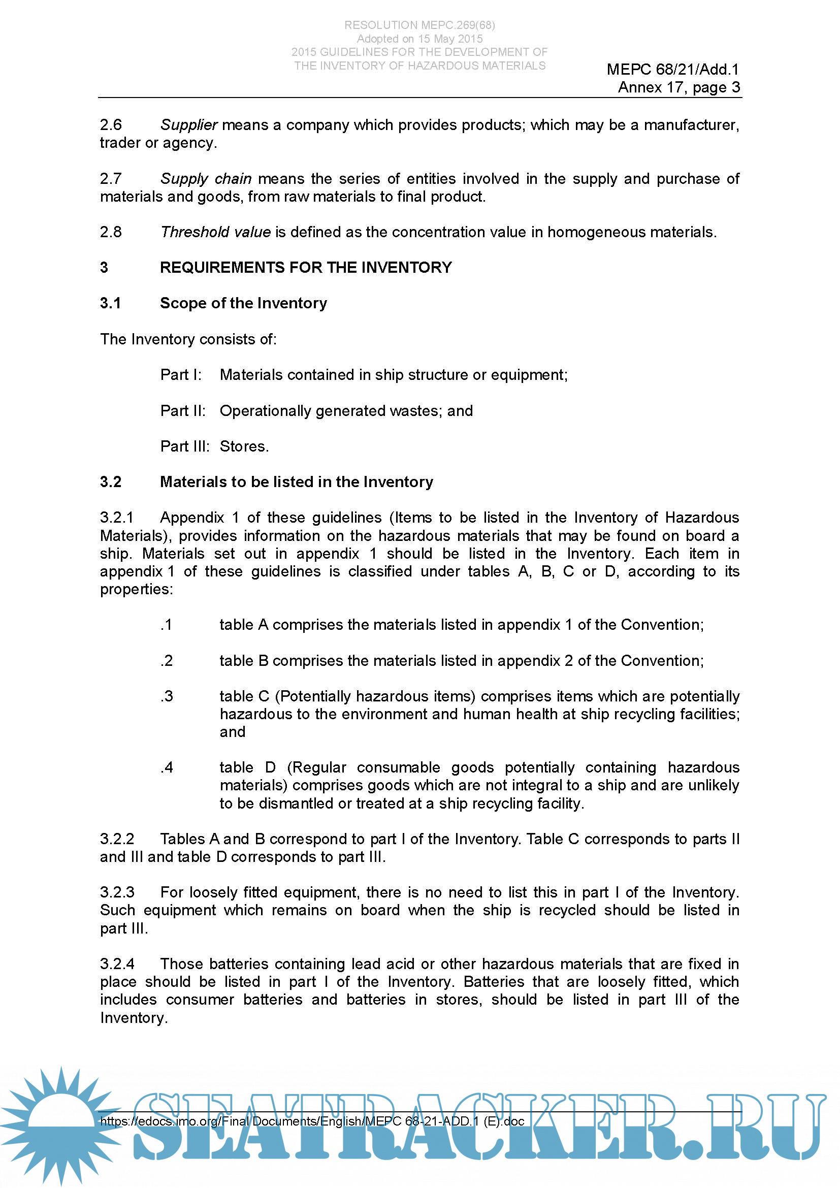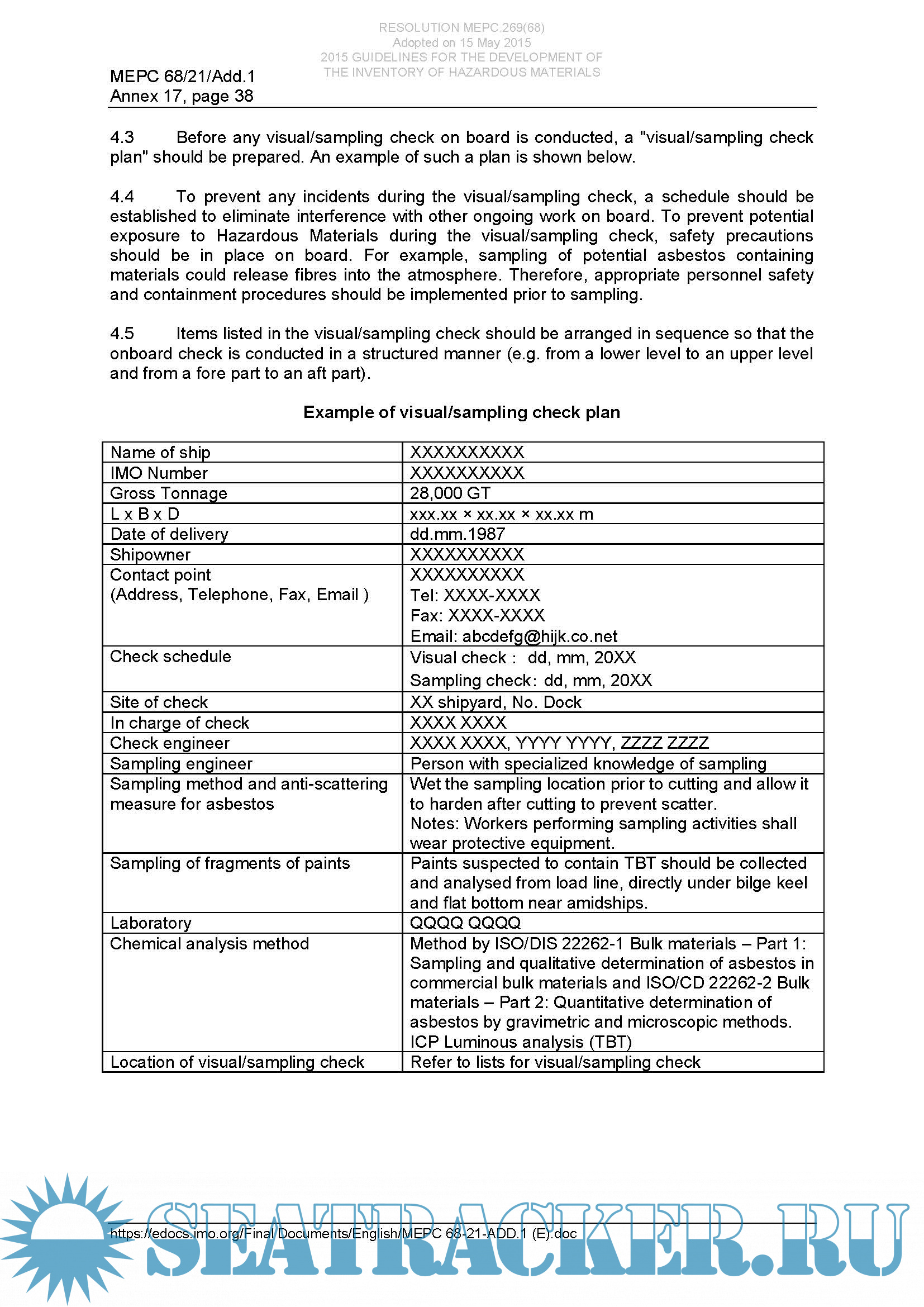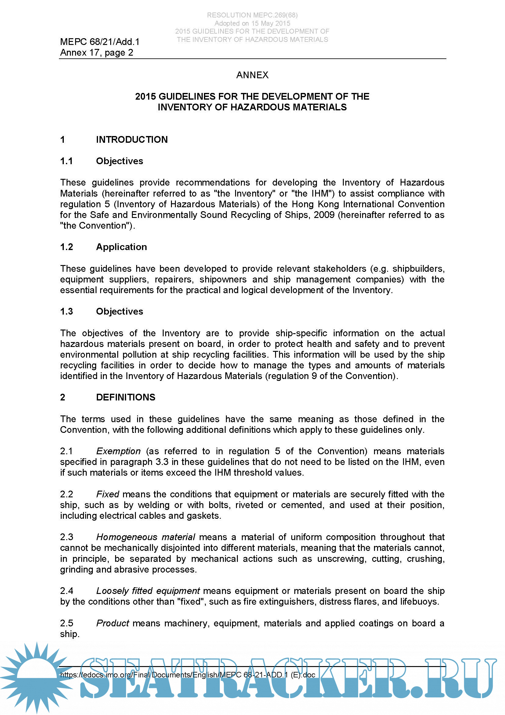 Year: 2015 Language: english Author: IMO Genre: Guide Format: PDF Quality: eBook Pages count: 55 Description: These guidelines provide recommendations for developing the Inventory of Hazardous Materials to assist compliance with regulation 5 (Inventory of Hazardous Materials) of the Hong Kong International Convention for the Safe and Environmentally Sound Recycling of Ships, 2009 . These guidelines have been developed to provide relevant stakeholders (e.g. shipbuilders, equipment suppliers, repairers, shipowners and ship management companies) with the essential requirements for the practical and logical development of the Inventory. The objectives of the Inventory are to provide ship-specific information on the actual hazardous materials present on board, in order to protect health and safety and to prevent environmental pollution at ship recycling facilities. This information will be used by the ship recycling facilities in order to decide how to manage the types and amounts of materials identified in the Inventory of Hazardous Materials (regulation 9 of the Convention).