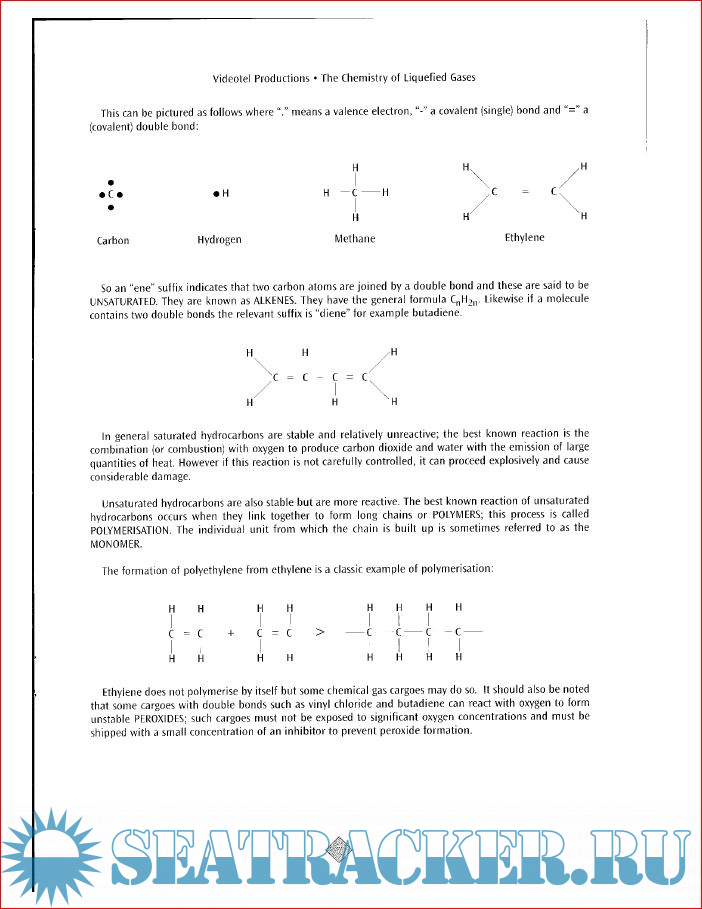 The structure of alkanes is described; isomerism with reference to, butane and their boiling points is explained. Then unsaturated molecules - alkenes - are described, followed by consideration of reactions with water and oxygen, leading to corrosion and a discussion about sulphur and mercaptans. Mention is made of the reaction of aluminium with LNG and mercury. The chemistry of unsaturated compounds is dealt with, with particular reference to propylene oxide and problems with asbestos. Polymerisation is next and the use of inhibitors. The importance of monomer specification is highlighted and the need to avoid conditions which will create the isotactic version of a polymer.