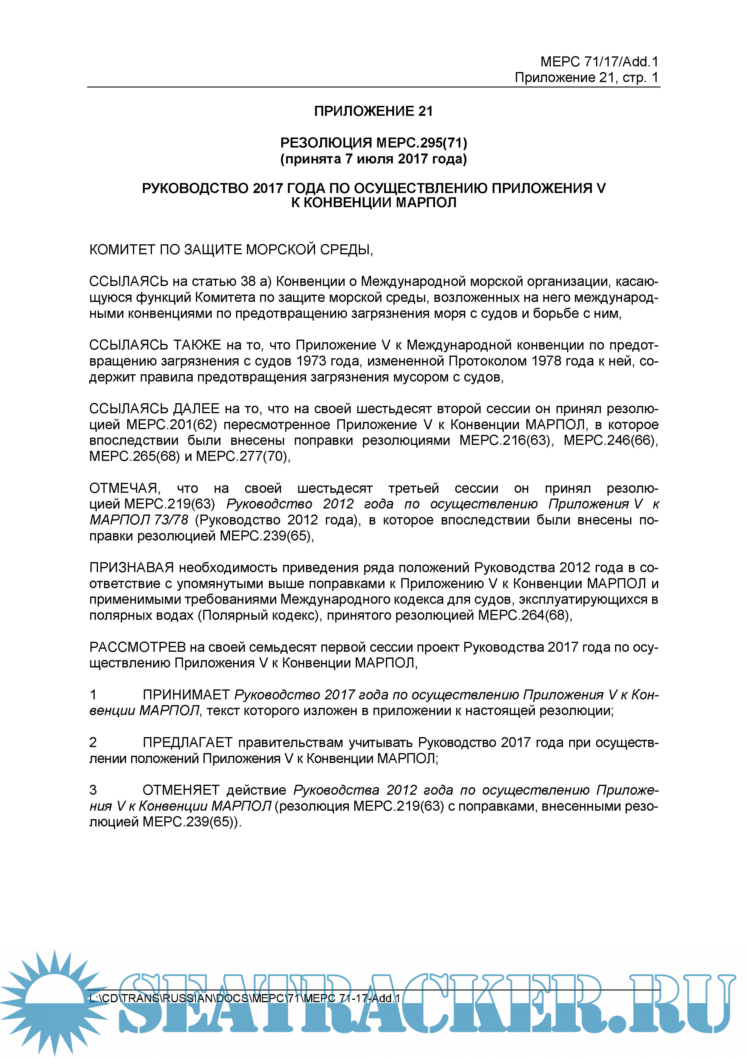 Год выпуска: 2017 Язык: русский Автор: ИМО. Комитет по защите морской среды (КЗМС) Жанр: Руководство Формат: PDF Качество: Неизвестно Количество страниц: 35 Описание: РУКОВОДСТВО 2017 ГОДА ПО ОСУЩЕСТВЛЕНИЮ ПРИЛОЖЕНИЯ V К КОНВЕНЦИИ МАРПОЛ Комитетом по защите морской среды (КЗМС) были приняты новые Резолюции (MEPC) в отношении поправок к Международной конвенции по предотвращению загрязнения с судов 1973 года (МК МАРПОЛ). В частности приняты поправки к Приложению V, которые вступают в силу с 1 марта 2018 г. (резолюция МЕРС.277(70), резолюция МЕРС.295(71)). РЕЗОЛЮЦИЯ MEPC.295(71) (принята 7 июля 2017 года) РУКОВОДСТВО 2017 ГОДА ПО ОСУЩЕСТВЛЕНИЮ ПРИЛОЖЕНИЯ V К КОНВЕНЦИИ МАРПОЛ ПРЕДИСЛОВИЕ Главные цели настоящего Руководства заключаются в оказании помощи: .1 правительствам в разработке и введении в действие национального законодательства, обеспечивающего осуществление Приложения V к Конвенции МАРПОЛ; .2 собственникам, операторам, экипажам судов, грузовладельцам и изготовителям оборудования в соблюдении требований, изложенных в Приложении V к Конвенции МАРПОЛ и соответствующем национальном законодательстве; и .3 операторам портов и терминалов в оценке и удовлетворении потребности в достаточных приемных сооружениях для мусора, образующегося на судах всех типов. В целях обеспечения единообразия правительствам предлагается обращаться к настоящему Руководству и связанным с ним рекомендациям Международной морской организации при разработке и обеспечении исполнения соответствующих национальных норм. Английский язык является одним из официальных и, в отличие от русского, рабочим языком ИМО. По этой причине, в случаях каких-либо разночтений, предпочтение должно отдаваться тексту на английском языке (ссылка