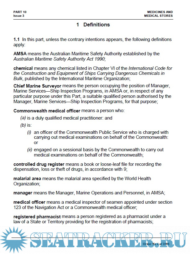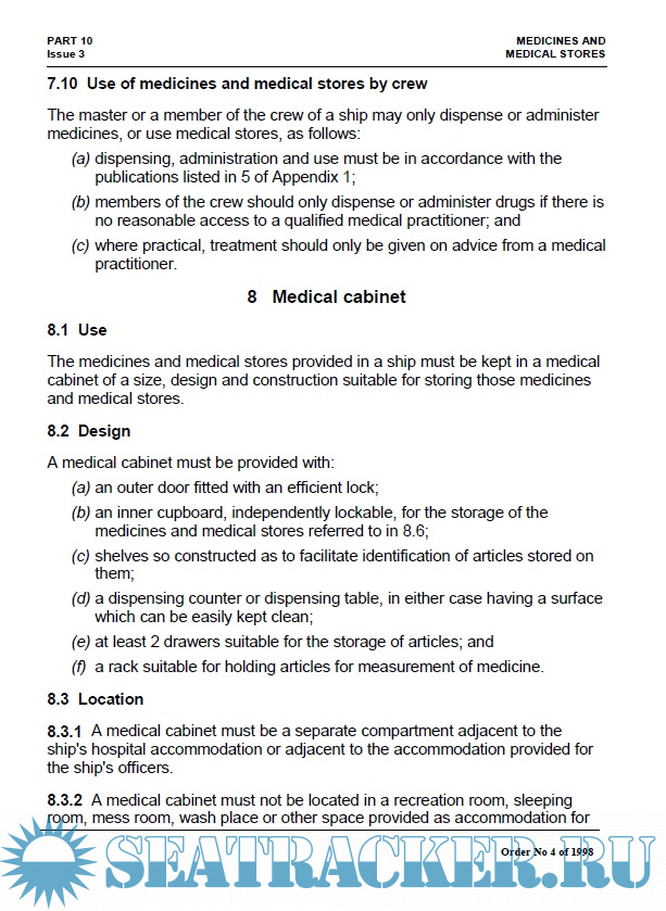 1 Definitions 2 Purpose 3 Application 4 Exemptions and equivalents 5 Review of decisions 6 Penal provisions 7 Medicines and medical stores 8 Medical cabinet 9 Dispensing certain drugs 10 Inspection 11 Prescribed matters 12 Transition Appendix 1 Scale of medicines and medical stores to be carried on board a ship Appendix 2 Contents of doctor's bag Appendix 3 Requirements for labelling, packaging and storage Appendix 4 Specifications for disinfectants