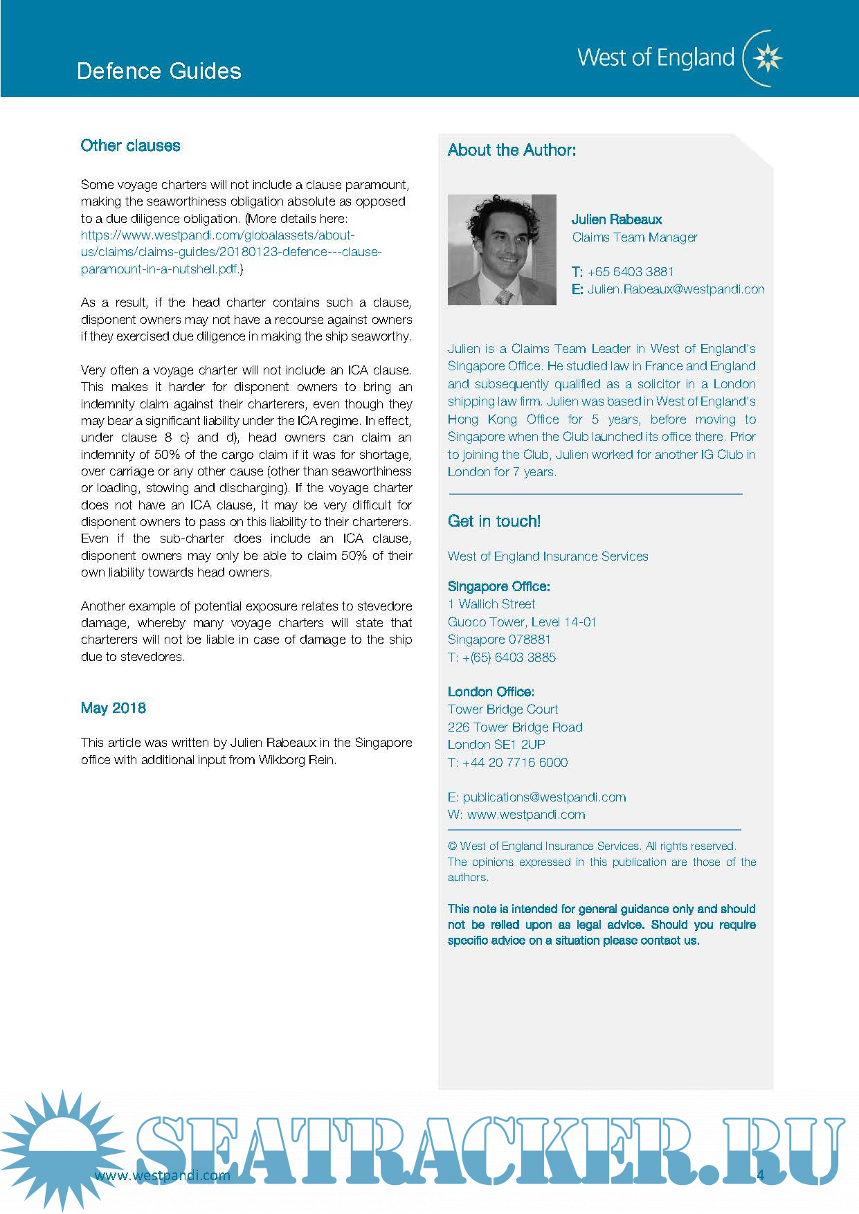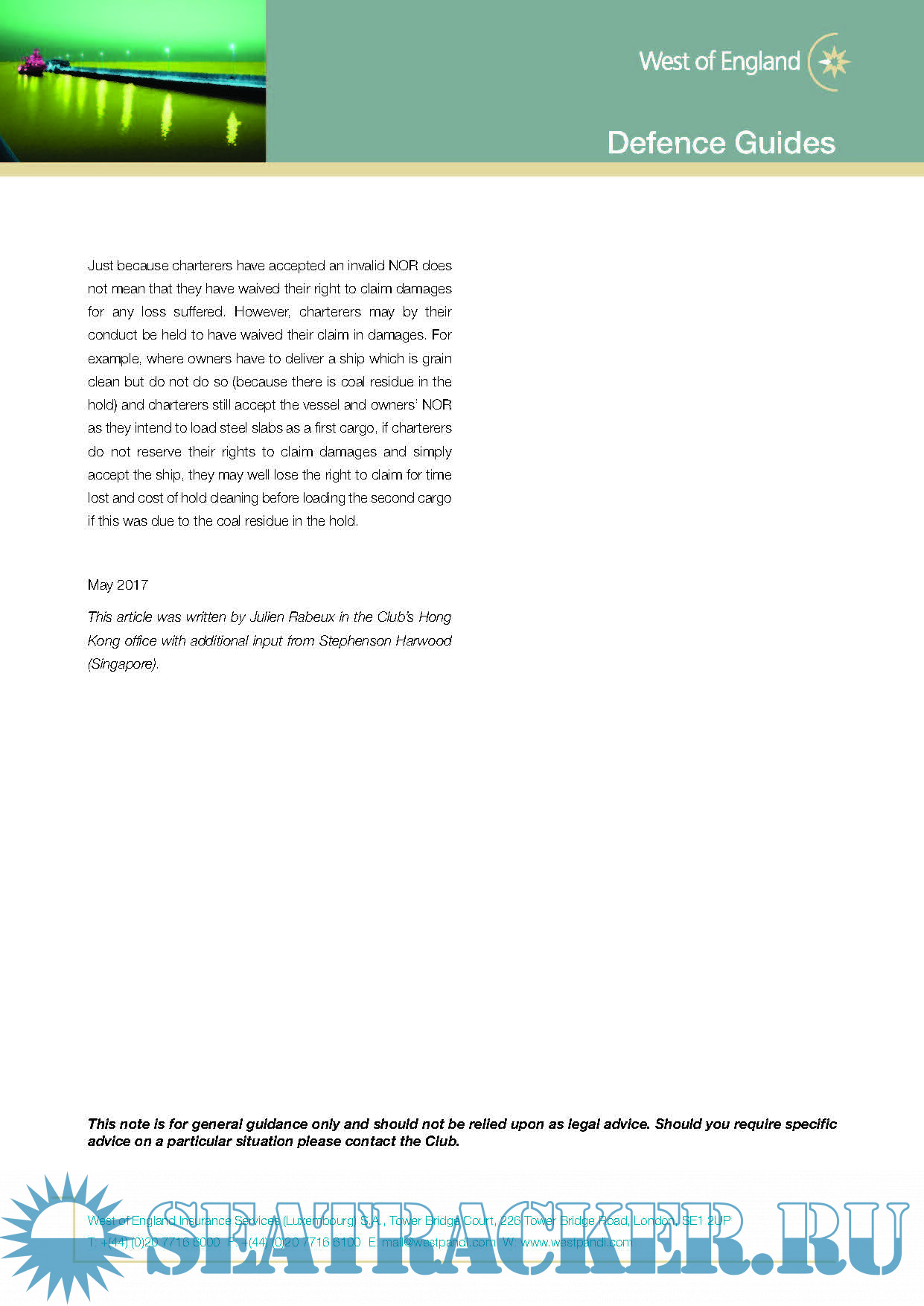 Year: 2018 Language: english Author: The West Of England P&I Genre: Guide Format: PDF Quality: eBook Pages count: 97 Description: Claims Guides Set out below are a number of guides for Members on matters they may typically encounter. They are not intended to be exhaustive but rather to provide a succinct and informative overview. Members requiring further advice on any topic are advised to contact the Managers. Defence Cover – “In a Nutshell” Guides The following are a series of articles intended to provide some general observations on commonly encountered Defence issues. Please note that these guides are based on current English law at the time of writing.