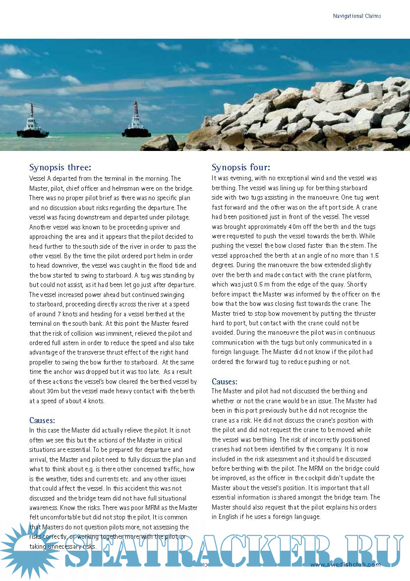 Year: 2014 Language: english Author: Swedish P&I Club Genre: Guide Format: PDF Quality: eBook Pages count: 36 Description: After reviewing recent years’ navigational claims, it becomes apparent that many of the causes are recurring. Some of the casualties happened because crew members deviated from procedures, didn’t discuss what was happening or one person made a disastrous mistake. This is why there should be multiple officers on the bridge during critical operations so one person’s mistake can be detected and rectified. That the Officer Of the Watch (OOW) didn’t follow the COLREG’s or the company’s Safety Management System is usually not the root cause to a casualty. The root cause is usually a combination of inexperience and issues within the organisation. This could manifest itself in the attitude that it has become acceptable to take unsanctioned risks and shortcuts. This will be discussed further in this publication.