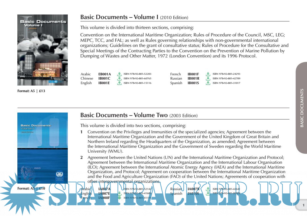 Description: IMO Publishing’s activities provide the world’s maritime community with numerous texts (conventions, codes, regulations, recommendations, guidelines, etc.) prepared by the Organization. There are over 200 titles available in English. Many are translated into Arabic, Chinese, French, Russian and Spanish. IMO Publishing also produces digital products, namely e-books, e-readers, electronic downloads, CDs and internet subscriptions. The dissemination of this information, including attendance at maritime exhibitions worldwide and regular e-newsletters to interested parties, plays an important role in promoting shipping as a safe, secure, efficient and environmentally-friendly method of transporting goods around the globe/