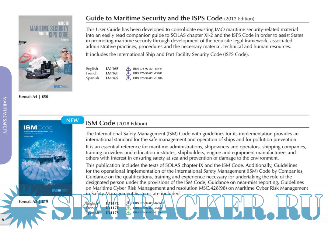 Year: 2018 Language: english Author: IMO Genre: Catalogue Publisher: IMO Edition: August 2018 Format: PDF Quality: eBook Pages count: 157 Description: IMO Publishing’s activities provide the world’s maritime community with numerous texts (conventions, codes, regulations, recommendations, guidelines, etc.) prepared by the Organization. There are over 200 titles available in English. Many are translated into Arabic, Chinese, French, Russian and Spanish. IMO Publishing also produces digital products, namely e-books, e-readers, electronic downloads, CDs and internet subscriptions. The dissemination of this information, including attendance at maritime exhibitions worldwide and regular e-newsletters to interested parties, plays an important role in promoting shipping as a safe, secure, efficient and environmentally-friendly method of transporting goods around the globe/