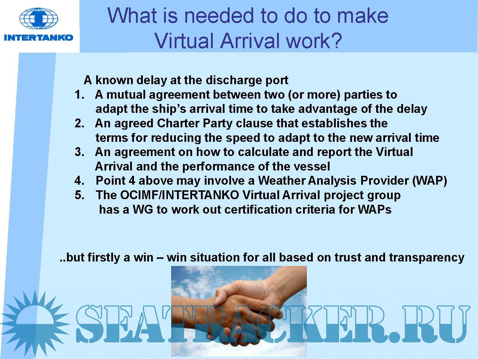 •The Virtual Arrival concept takes advantage of inefficiency within the transport chain through an agreed and managed reduction of a vessels passage speed