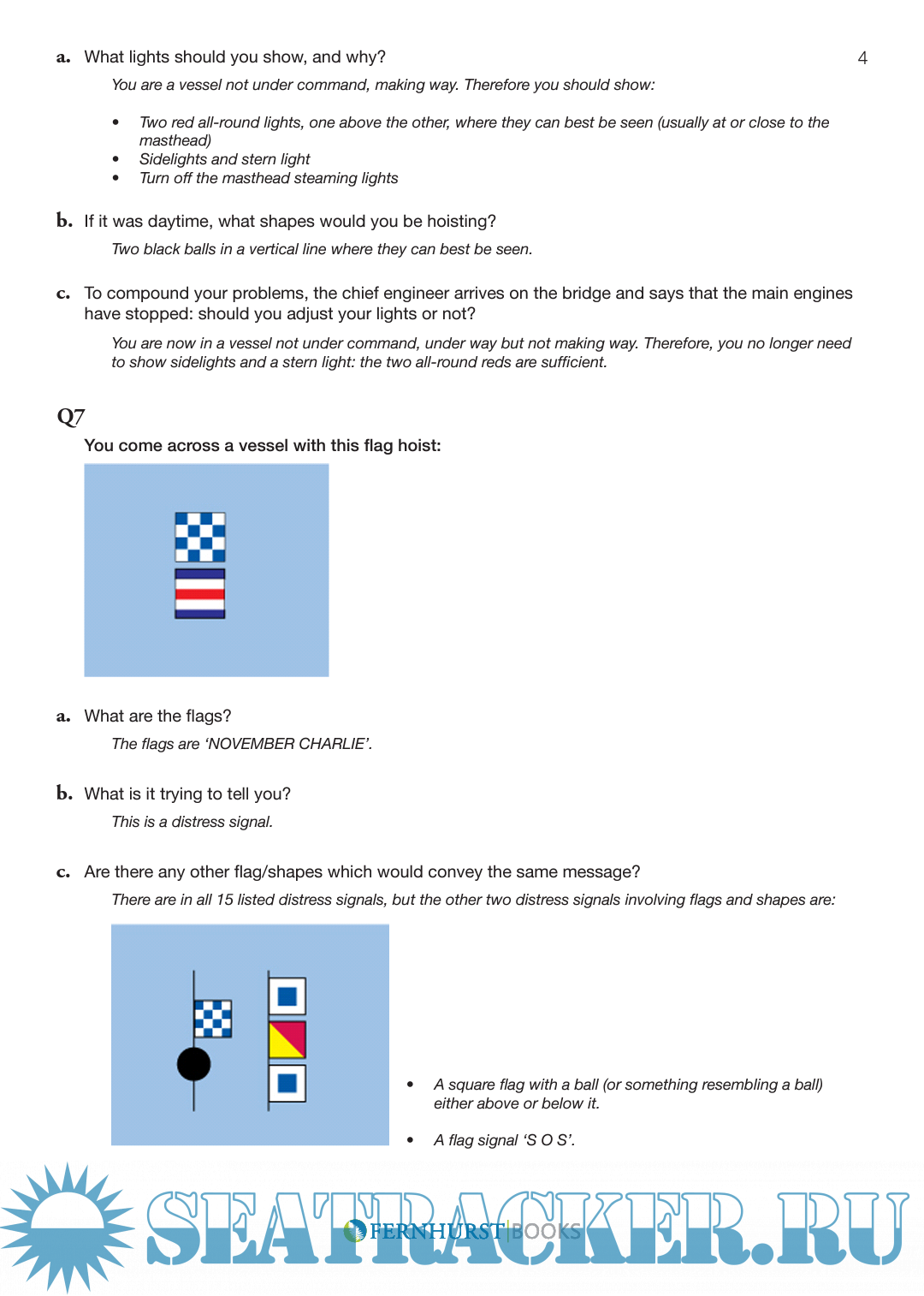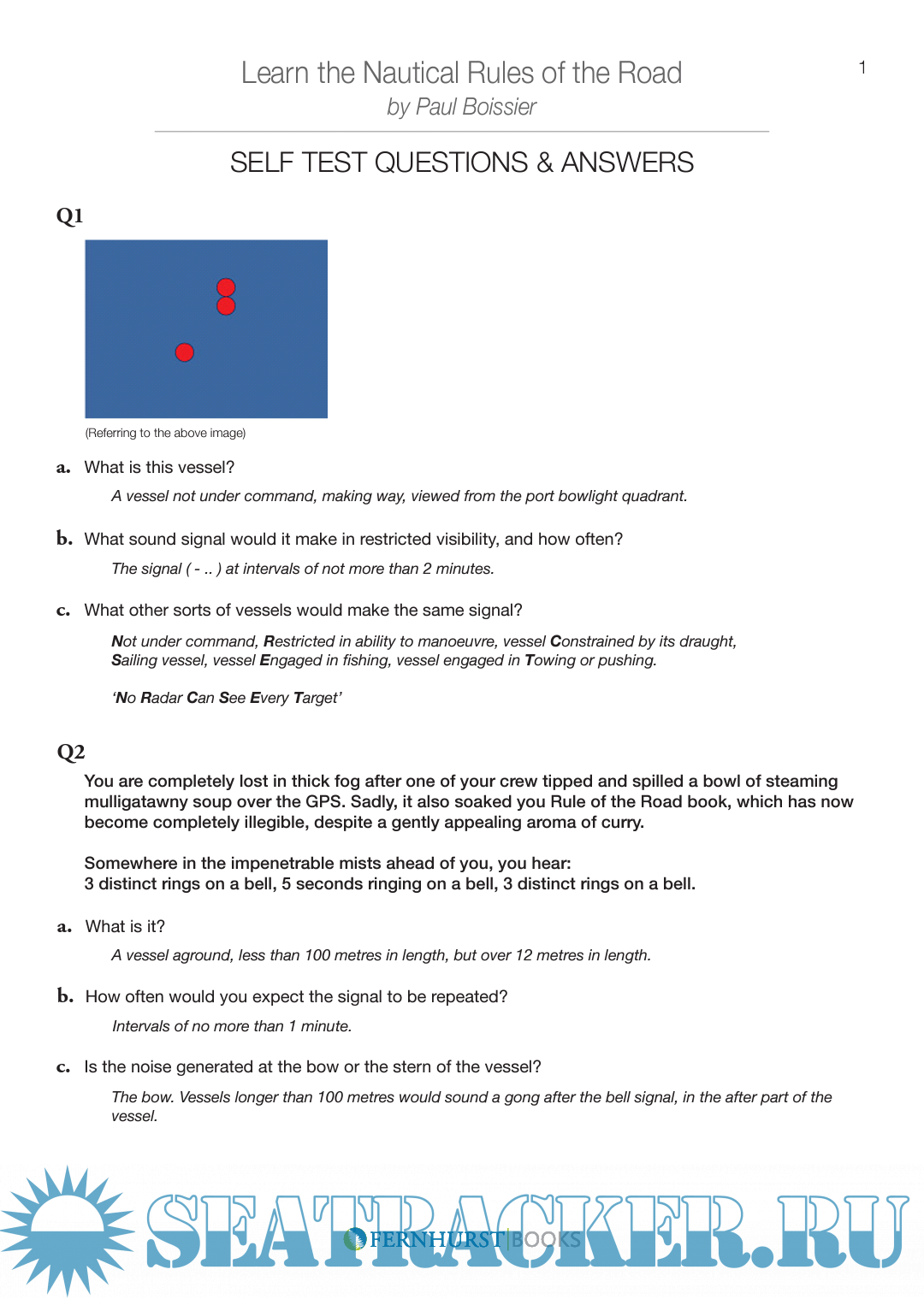 Year: 2013 Language: english Author: Paul Boissier Genre: Reference book Publisher: Fernhurst Books Format: PDF Quality: Scanned pages + text layer Pages count: 23 Description: It's a collection of questions and their answers on Collision Regulations. It gives a clear idea what to do in various situations , through these answers and also covers many topics as IALA Buoyage , Lights ,Shapes etc. It's a useful guide for the candidate prepaing for their exams .