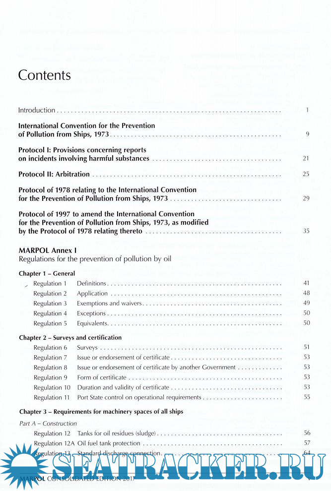 Description: The International Convention for the Prevention of Pollution from Ships, 1973 (MARPOL Convention), is concerned with preserving the marine environment through the prevention of pollution by oil and other harmful substances and the minimization of accidental discharge of such substances. Its technical content is laid out in six Annexes, the first five of which were adopted by the 1973 Convention, as modified by a 1978 Protocol. These Annexes cover pollution of the sea by oil, by noxious liquid substances in bulk, by harmful substances in packaged form, by sewage from ships, and by garbage from ships. Annex VI was adopted by a further Protocol in 1997 and covers air pollution from ships.The 2017 consolidated edition aims to provide an easy and comprehensive reference to the up-to-date provisions and Unified Interpretations of the Articles, Protocols and Annexes of the MARPOL Convention, including the incorporation of all the amendments that have been adopted by the Marine Environment Protection Committee (MEPC).