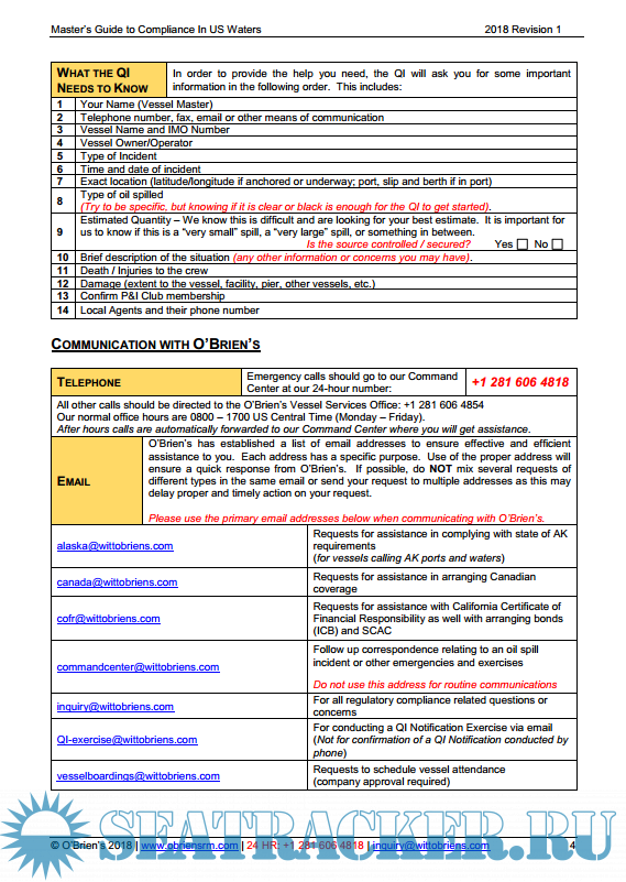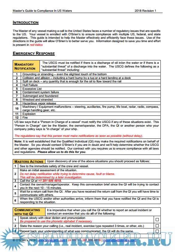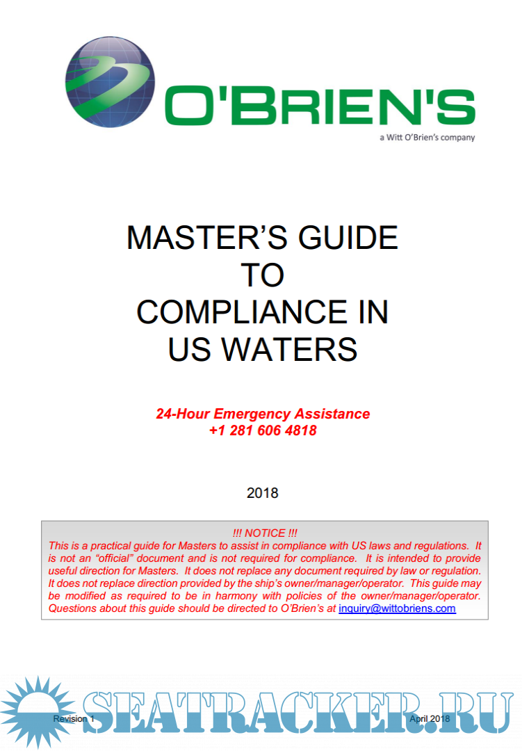 Description: This is a practical guide for Masters to assist in compliance with US laws and regulations. It is not an “official” document and is not required for compliance. It is intended to provide useful direction for Masters. It does not replace any document required by law or regulation. It does not replace direction provided by the ship’s owner/manager/operator. This guide may be modified as required to be in harmony with policies of the owner/manager/operator. Questions about this guide should be directed to O’Brien’s at [email protected]