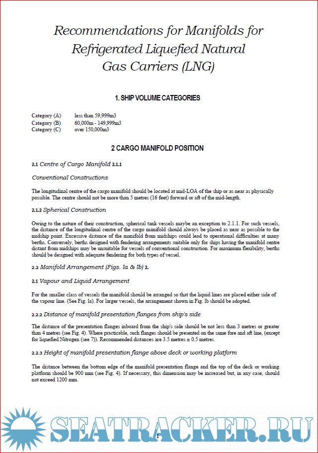 Description: These recommendations are promulgated to introduce conformity in manifold arrangements of Liquefied Natural Gas Carriers (LNG) in order to promote improved efficiency in operation and assist in planning the position of loading and discharging facilities on new jetties.