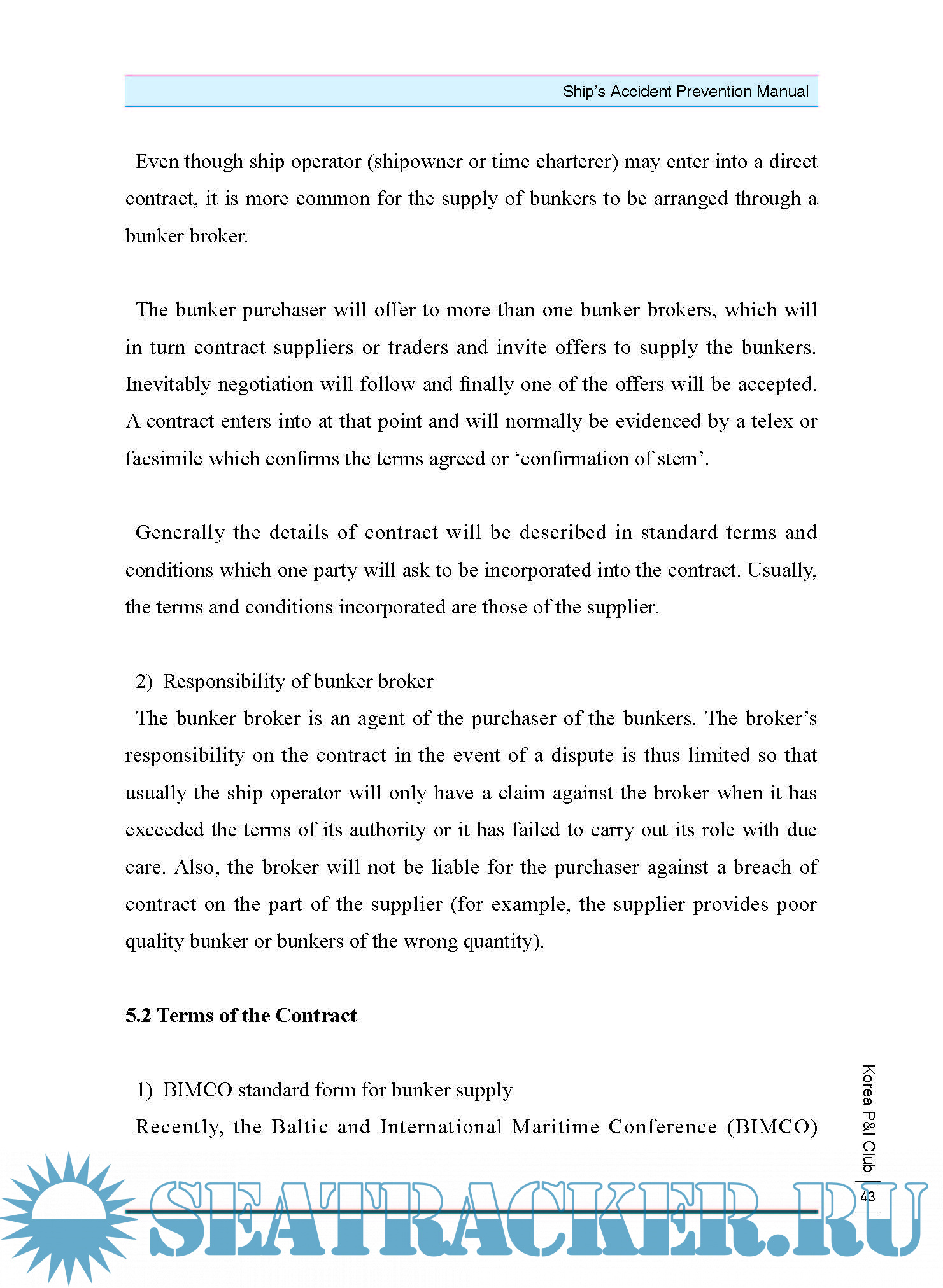Year: 2015 Language: english Author: KOREA P&I Genre: Guide Format: PDF Quality: eBook Pages count: 62 Description: The purpose of this guide is to provide basic knowledges on the use and management of ship’s fuel oils for ship’s master, chief engineer, ships’ officers and shore superintendents. This guidance is also aimed at having ship operators recognize properly every problems experiencing on board in the process of bunkering and handling bunker fuel oils on board, such as a lot of loss of human lives, loss of ship or crucial marine pollution accident, and provide ship operators how to get necessary evidences in case of having any problem of bunker quantity and quality so as to minimize damages resulted from the problem.