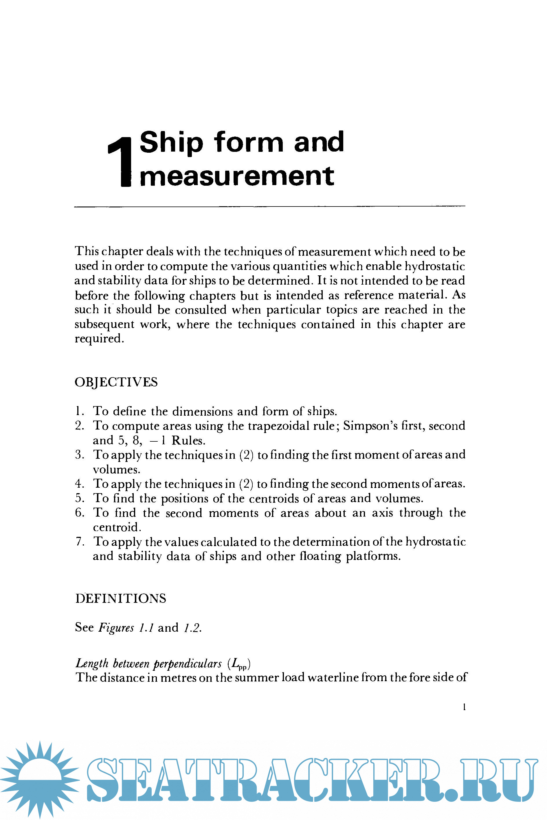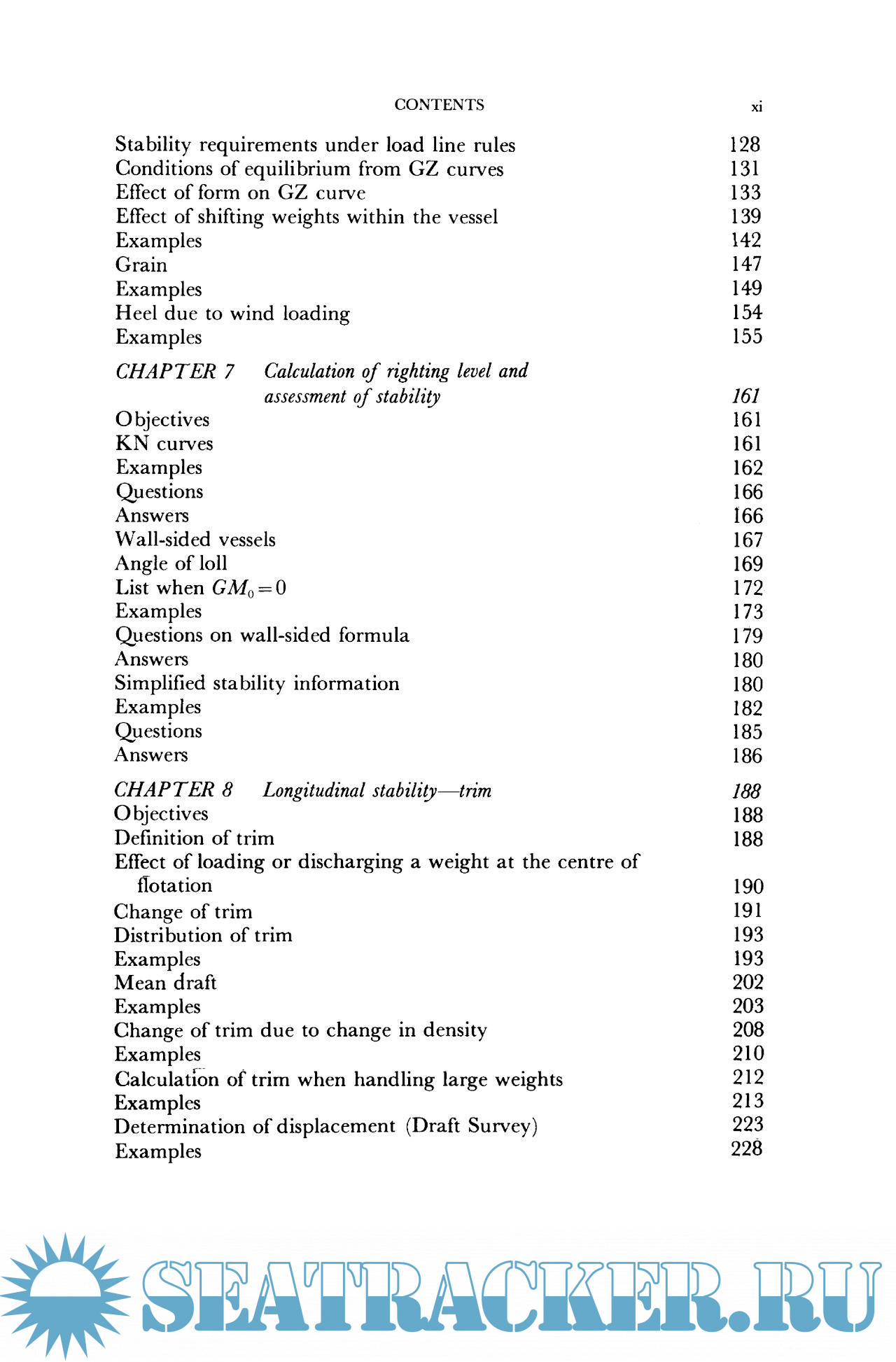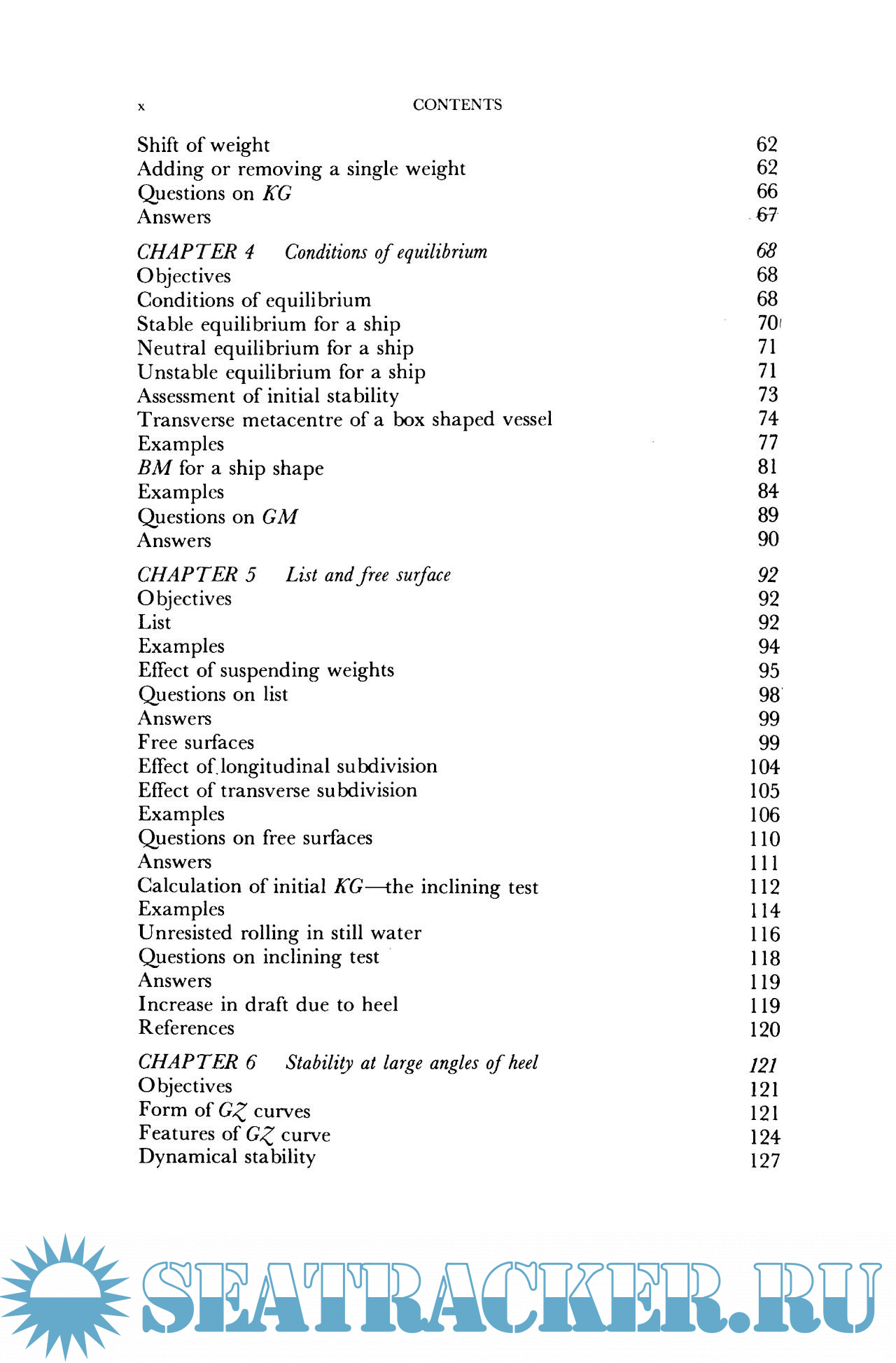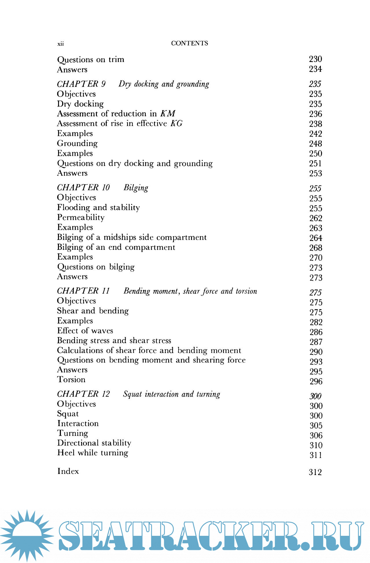 The book discusses the methods of Simpson's rules for measuring ship form, the principle of floatation, finding the position of the center of gravity, and the effect of the center of gravity of the vessel not being on the centerline, the effect of having liquids within the vessel which are free to move and the effect of suspending weights. Topics on the assessment of stability of large angles of heel, regulations about merchant vessel stability, and dry docking and grounding are provided as well.