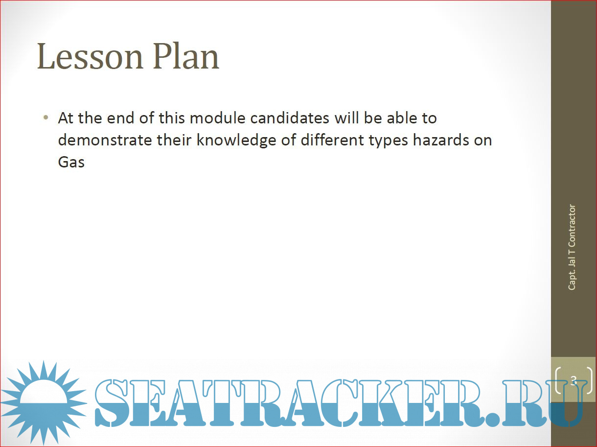 Description: At the end of this module candidates will be able to demonstrate their knowledge of different types hazards on Gas.