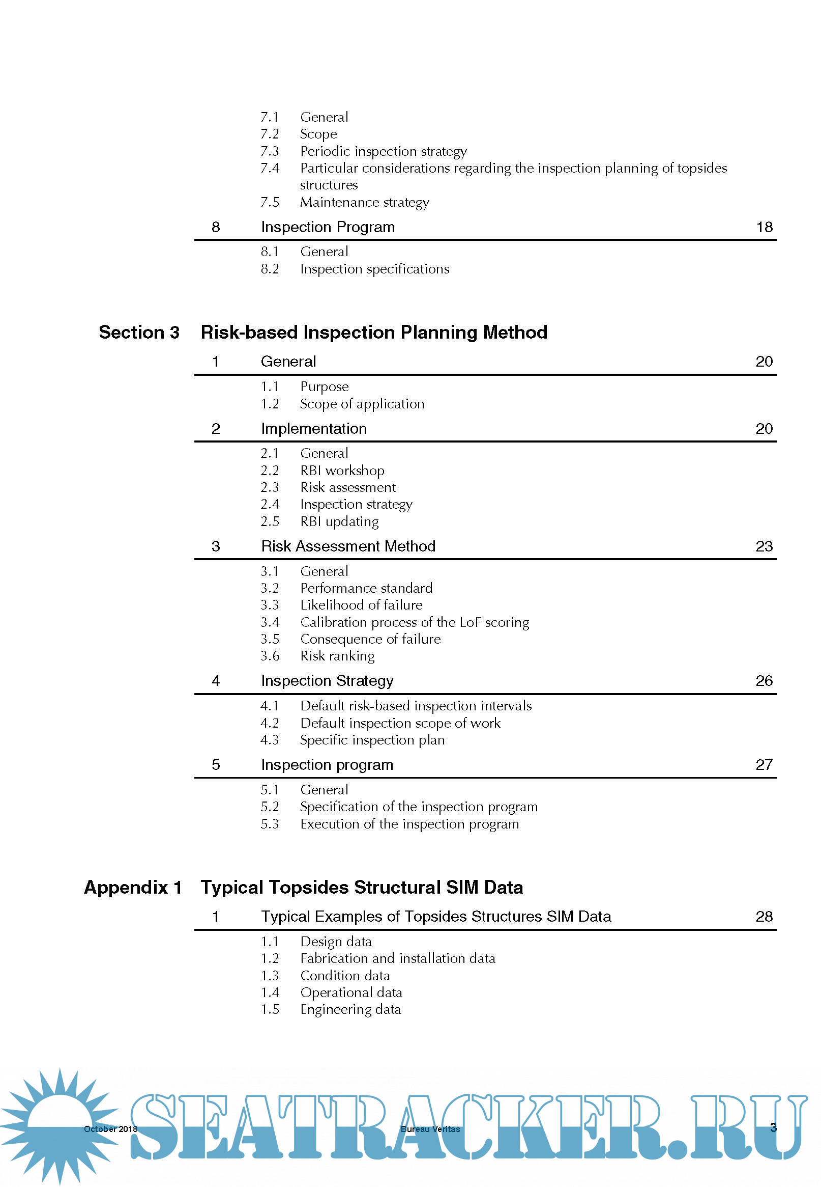 Year: 2018 Language: english Author: BV Genre: Guide ISBN: NI 653 DT R00 Format: PDF Quality: eBook Pages count: 35 Description: Current industrial practice for the inspection of topsides structures is based on API-RP-2SIM requirement that inspection of topsides structure be performed annually by visual examination. However, the final report of the Joint Industry Project (JIP) on the Structural Integrity Management (SIM) of topsides structures acknowledged that even if the annual visual inspection allows a high proportion of typical degradations to be detected, it may fail in detecting those that lead to a significant percentage of the reported failures (MSL, 2004). It proposed therefore a risk-based approach as an alternative to improve topsides inspection regimes. This leads to more frequent and detailed inspection of high-risk structures increasing the likelihood of detecting early enough critical defect. Following the release of the API-RP-2SIM which addresses the issue of Risk-Based Inspection (RBI) especially for the underwater structure of fixed offshore platforms, the development of guidance for the RBI of other offshore structures, especially topsides structures is being considered. In this vein, the International Organization for Standardization (ISO) has developed a specific standard for the SIM of offshore structures (ISO/DIS 19901-9) including topsides structures in which guidance for performing RBI is provided.