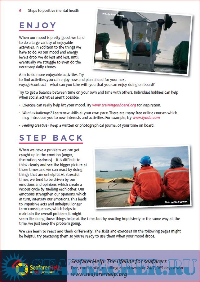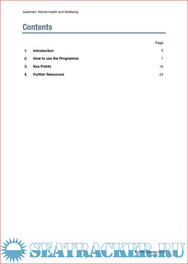 Year: 2018 Language: english Author: KVH Videotel & ISWAN Genre: Training courses Publisher: KVH Videotel & ISWAN Format: PDF Quality: eBook Pages count: Multiple Description: This training package explores what seafarers can do to improve their mental health and wellbeing so that they can deal better with the challenges of life on board. The programme is intended for all crew, and the learning objectives are: • to be aware of the impact that mental health and wellbeing issues can have on individuals and the importance of actively working towards enhancing them • to know how to improve mental health and wellbeing using practical tools and strategies • to be able to recognise signs of mental health problems or when people might be finding it difficult to cope and to know what to do about it • to know how to find appropriate shore support when needed. The programme has been produced in association with the International Seafarers Welfare and Assistance Network (ISWAN). Much of the guidance is taken from ISWAN’s publications Psychological Wellbeing at Sea, Steps to Positive Mental Health, and Managing Stress and Sleeping Well at Sea, which also form part of the package along with the video and these facilitator notes. Additional info: https://landing.videotel.com/se...23269879789&