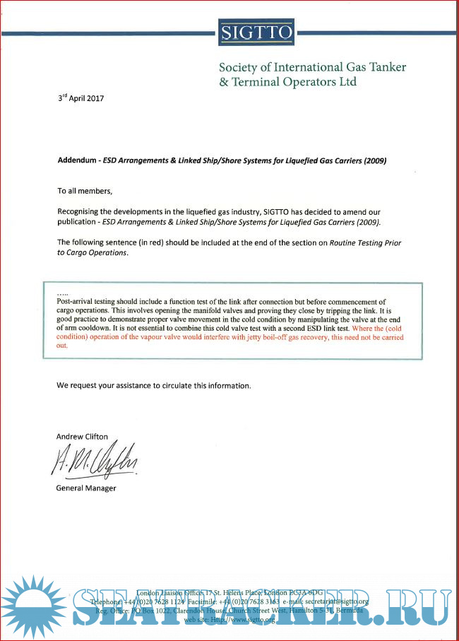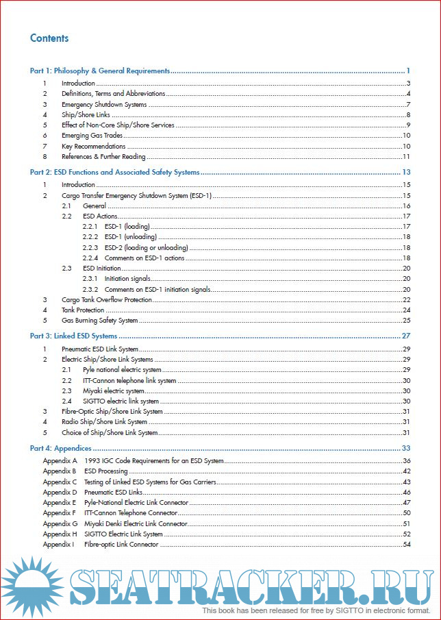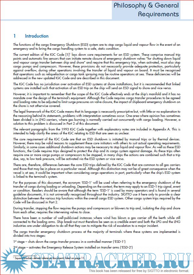 Description: SIGTTO has produced this guidance note due to members’ concerns about the different interpretations of the functional requirements for ESD systems, particularly those differences between the needs of the LNG industry and those of the LPG industry and how these may interact with linked ship/shore shutdown systems. This document is also intended to promote and encourage more widespread use of linked ESD systems at both LNG and LPG terminals, particularly where cargo transfer rates are high or where the cargo being handled is one of the products referred to in Chapter 17 of the 1993 edition of the IGC Code. It is not the intention of this document to contradict any national or international standards or requirements for operational practices at the liquefied gas ship/shore interface.