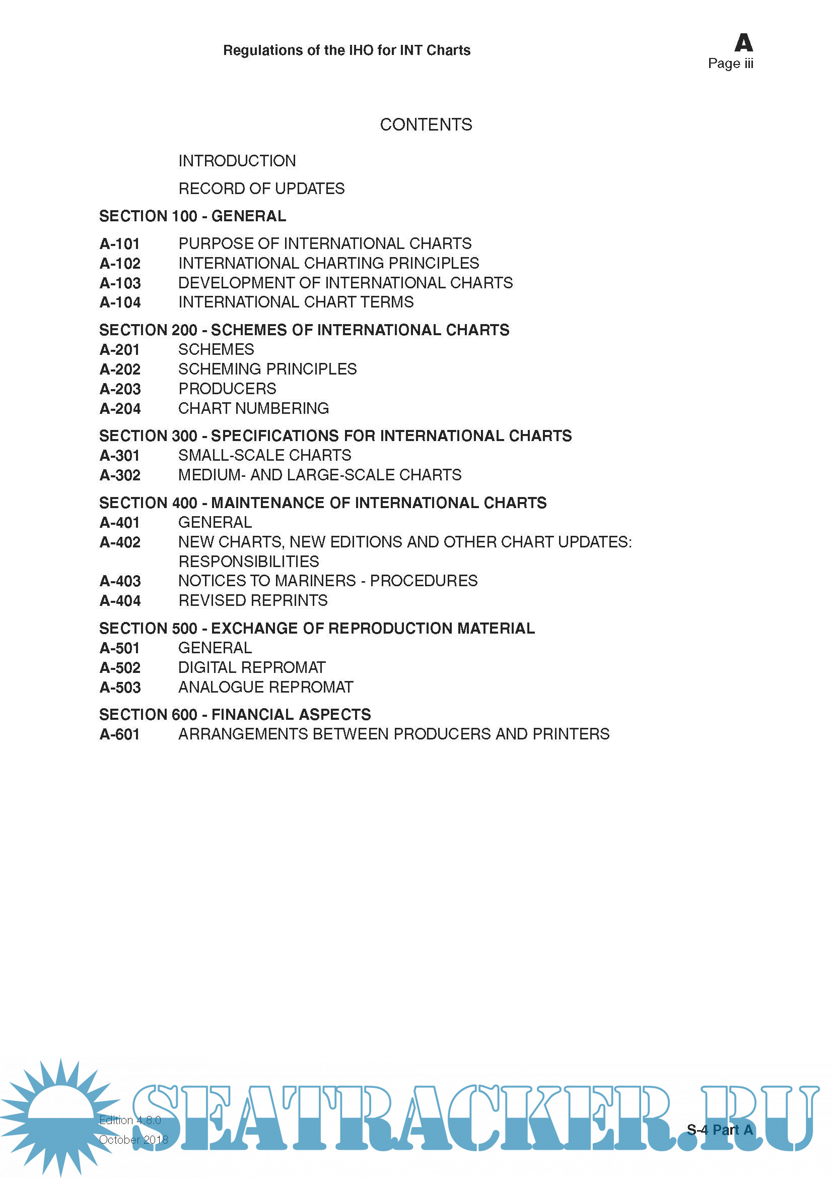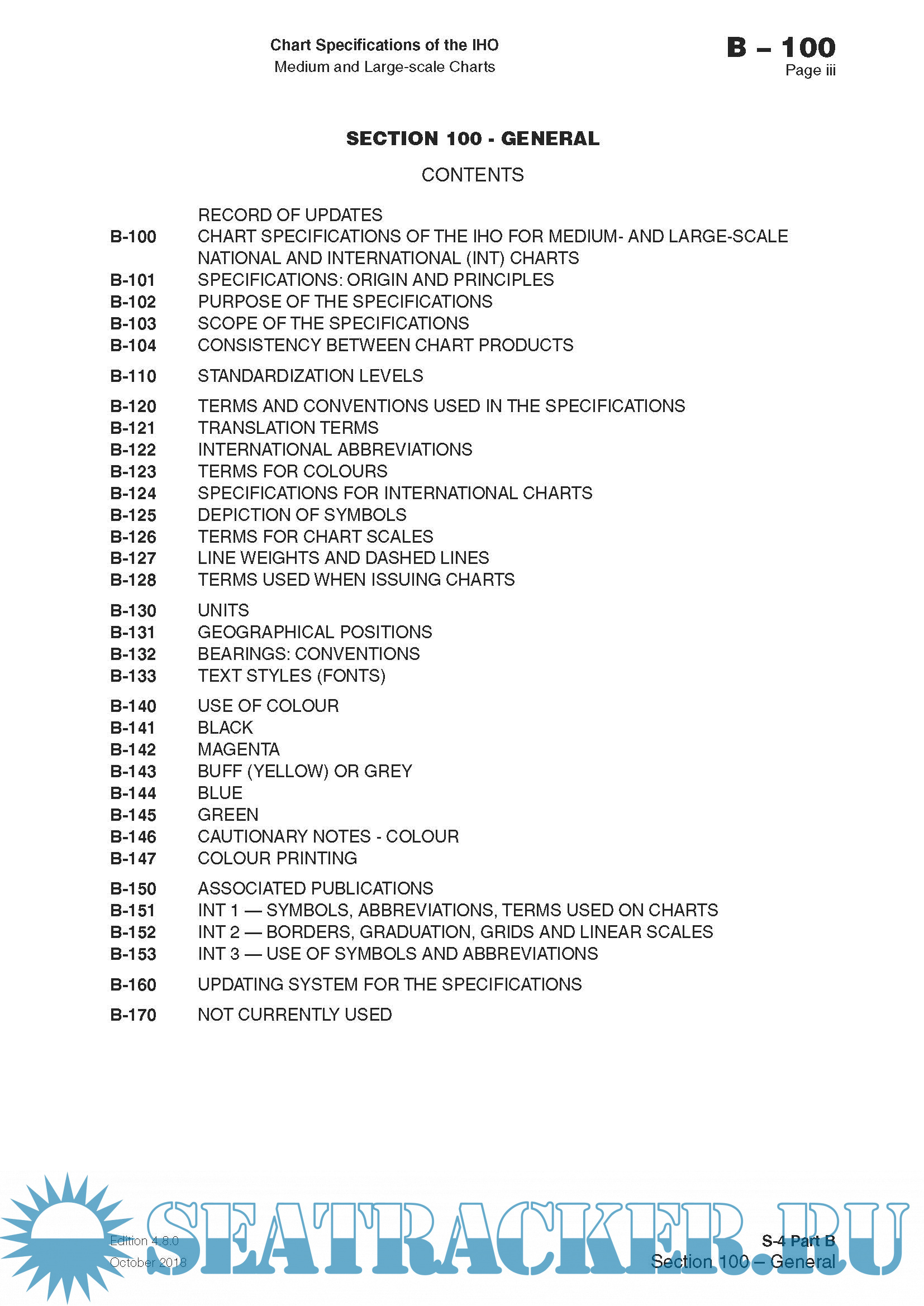 • Part A: ‘Regulations of the IHO for International (INT) Charts’• Part B: ‘Chart Specifications of the IHO for Medium- and Large-scale National and International (INT) Charts’• Part C: ‘Chart Specifications of the IHO for Small-Scale International (INT) Charts’
