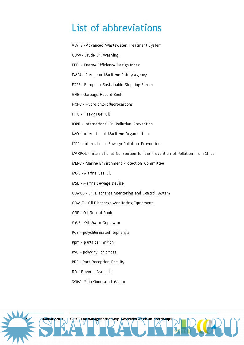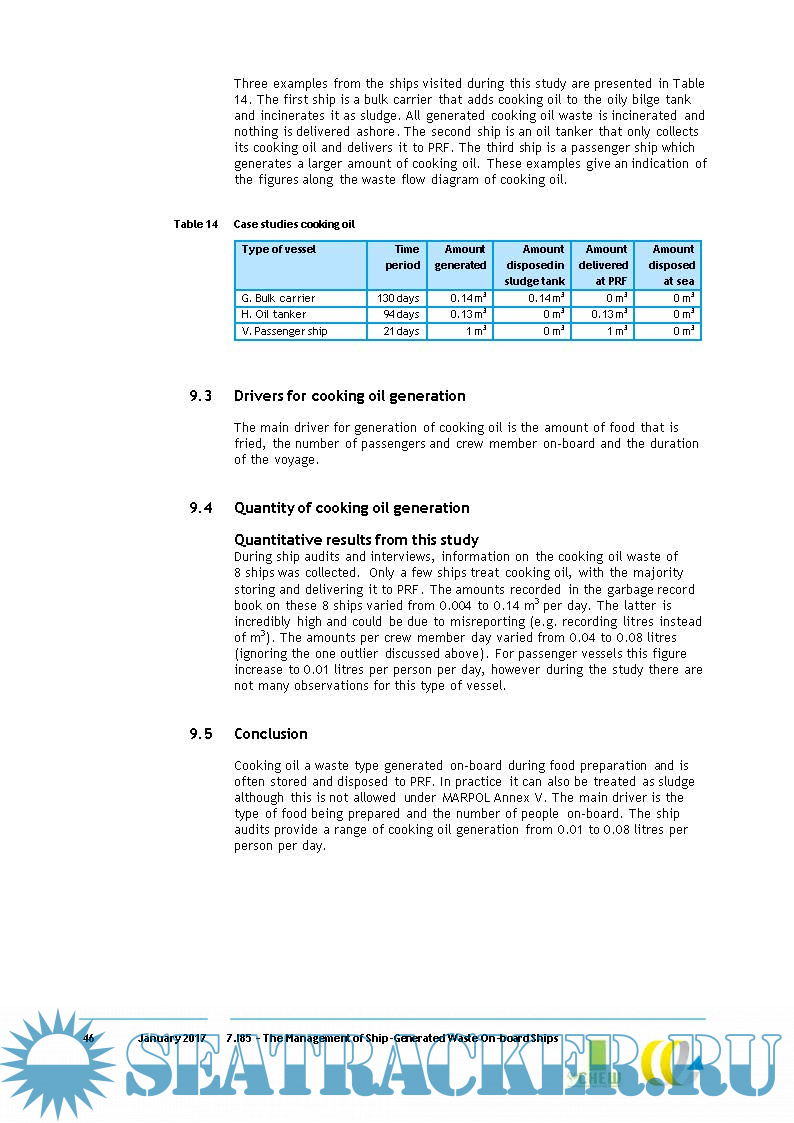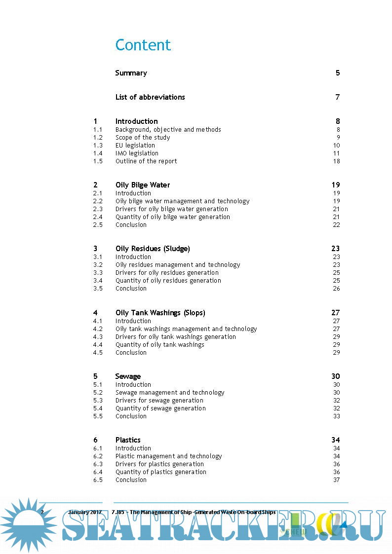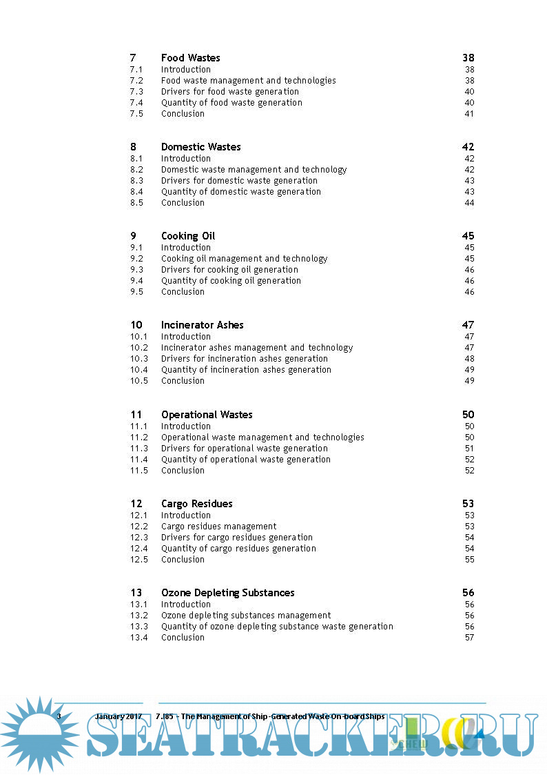 Year: 2017 Language: english Author: Delft Genre: Research papers Format: PDF Quality: eBook Pages count: 90 Description: This study provides an empirical overview of the management, drivers, technologies and the quantities of different categories of ship-generated waste. The data presented in this report have been collected from ship audits, interviews, a literature review, an online survey among stakeholders and audits of waste notification forms. For almost every type of ship-generated waste, there is a variety of waste flows and on-board treatment methods. The empirical evidence gathered in this study shows that ships use different treatment methods and often only treat part of a waste stream. This results in a difference between the amounts of waste generated and the amounts landed.