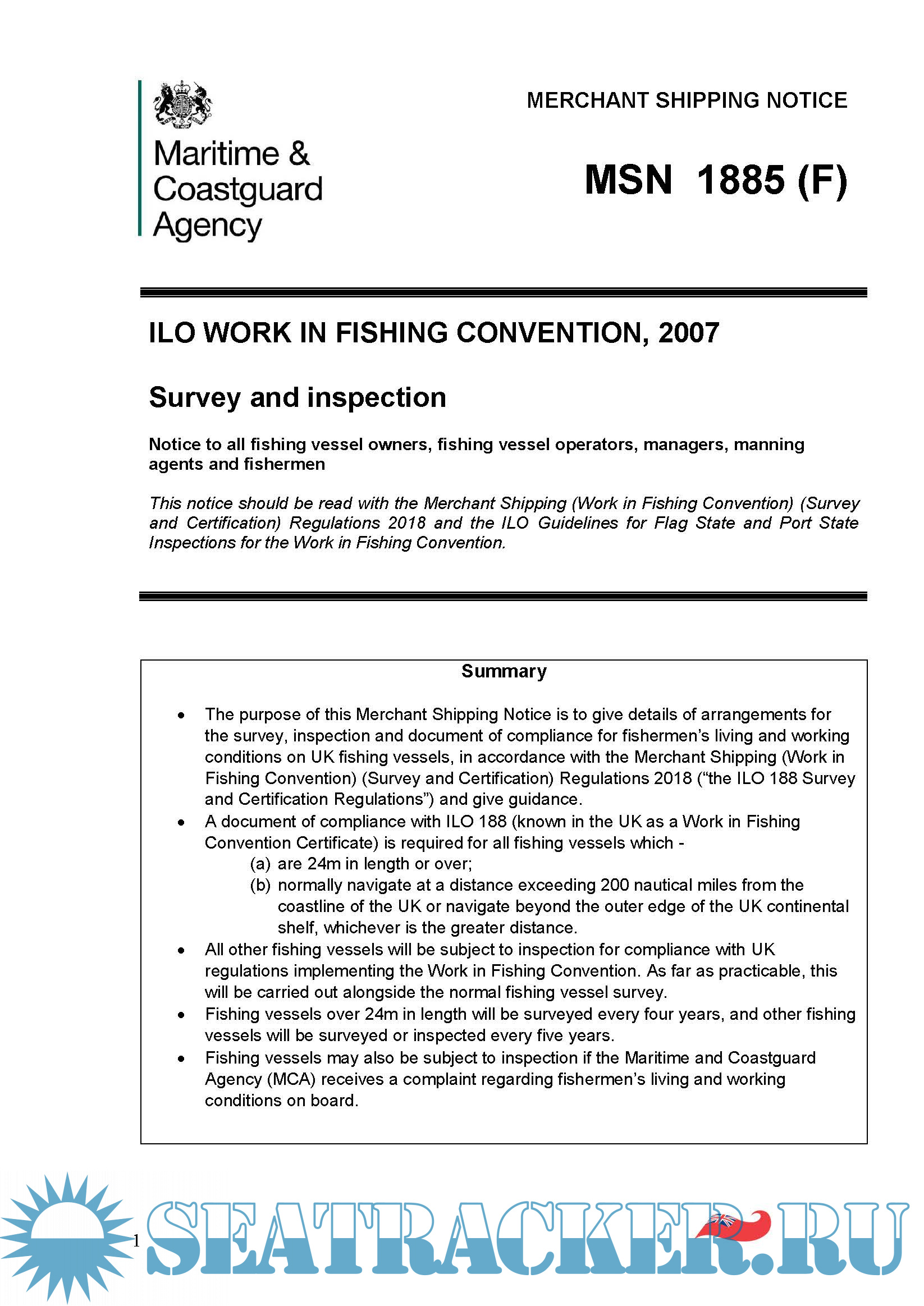 The ILO Work in Fishing Convention (ILO 188) requires ratifying states to establish a system to ensure that fishing vessels which fly its flag comply with the requirements of the Convention. The UK will do this by regular inspection of living and working conditions all UK fishing vessels, where practical alongside the regular survey of the fishing vessel. In addition, fishermen will be able to raise a complaint with the MCA if they believe that their living and working conditions do not comply with the Convention. Information about the complaints system is contained in MGN 589 (F).