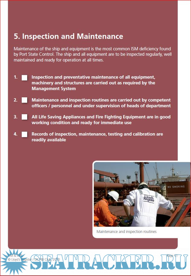 Description: In conjunction with an industry partner, the UK P&I Club, Lloyd's Register have analysed data including deficiencies found by Port State Control Officers relating to ISM & ISPS. The result is this convenient and re-usable Checklist, highlighting the most common deficiencies.