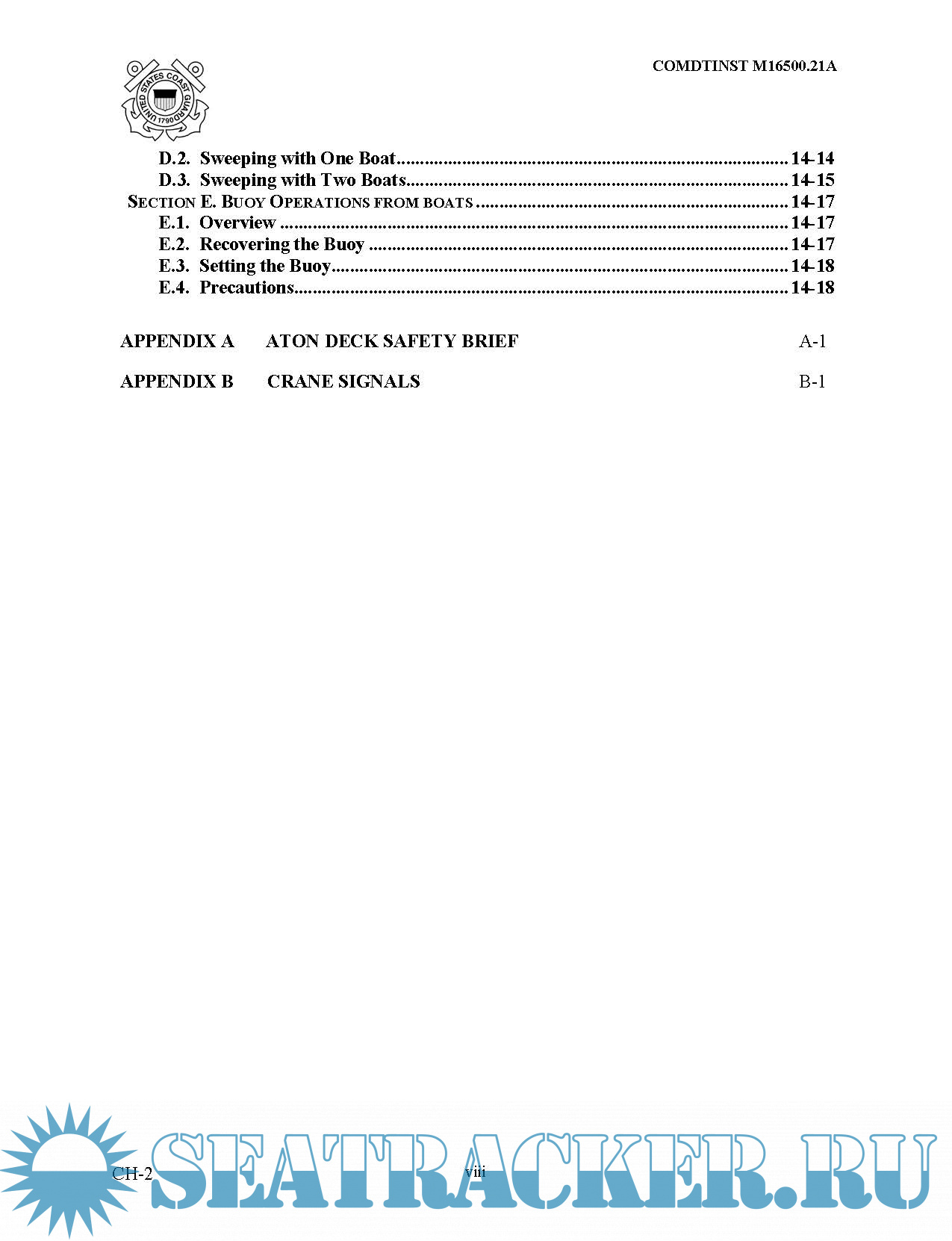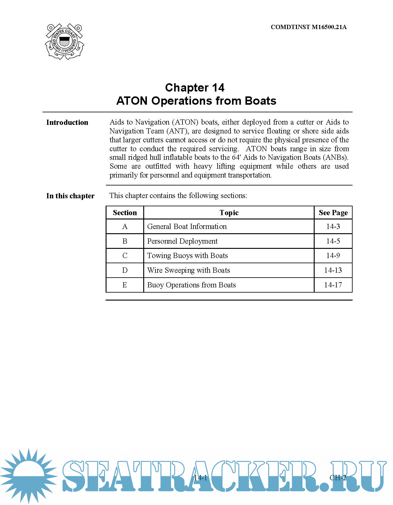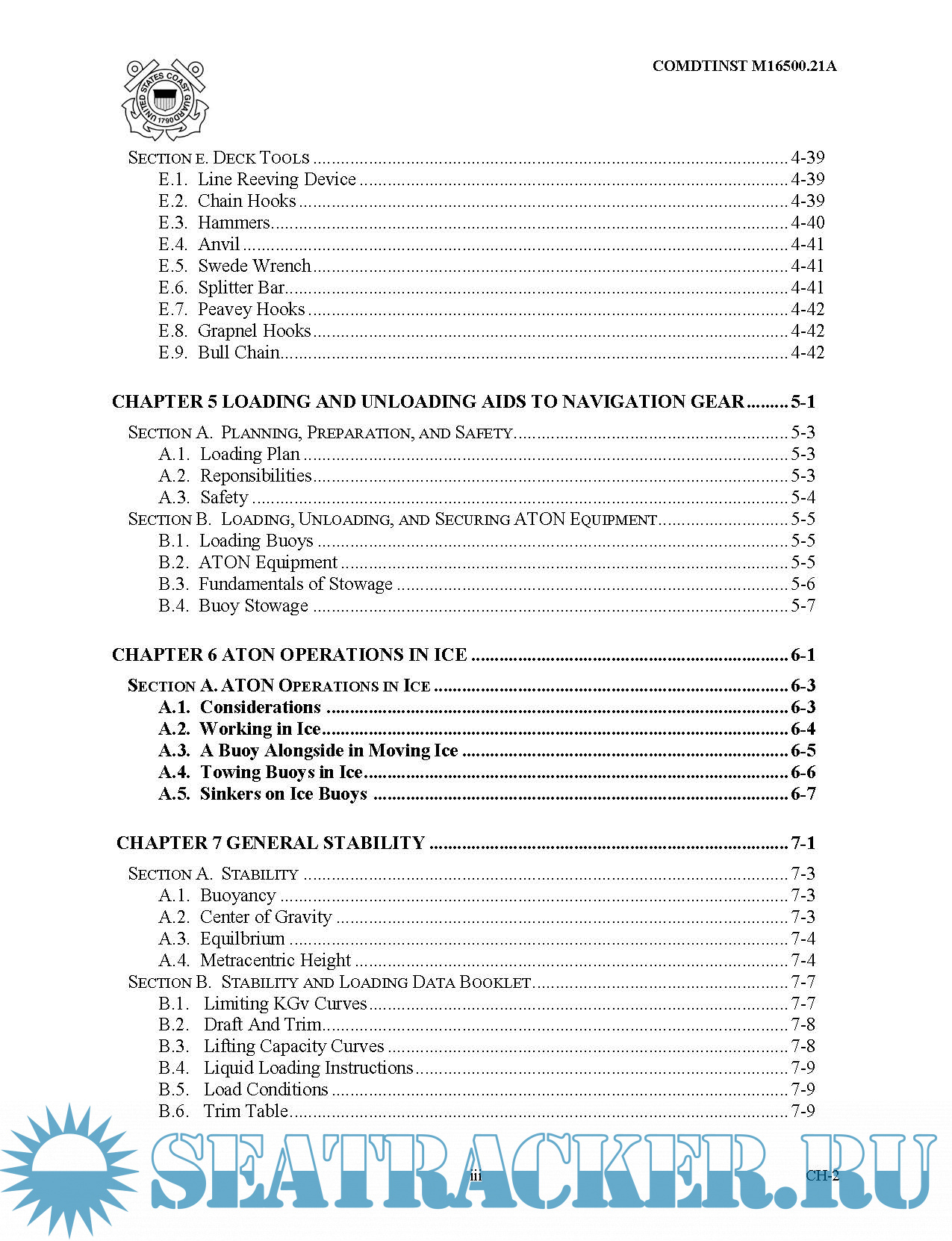 Description: This Manual replaces and updates the Aids to Navigation Manual – Seamanship. This Manual promulgates policy and guidance for seamanship practices for Coast Guard Aids to Navigation units and serves as a guide for wire rope practices throughout the Coast Guard.