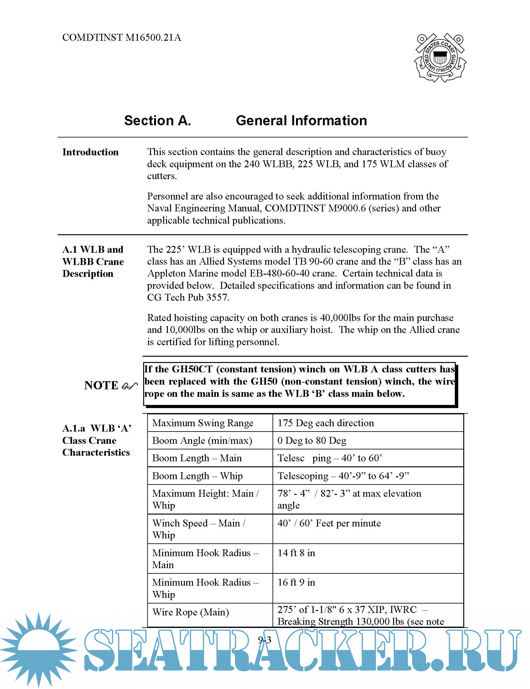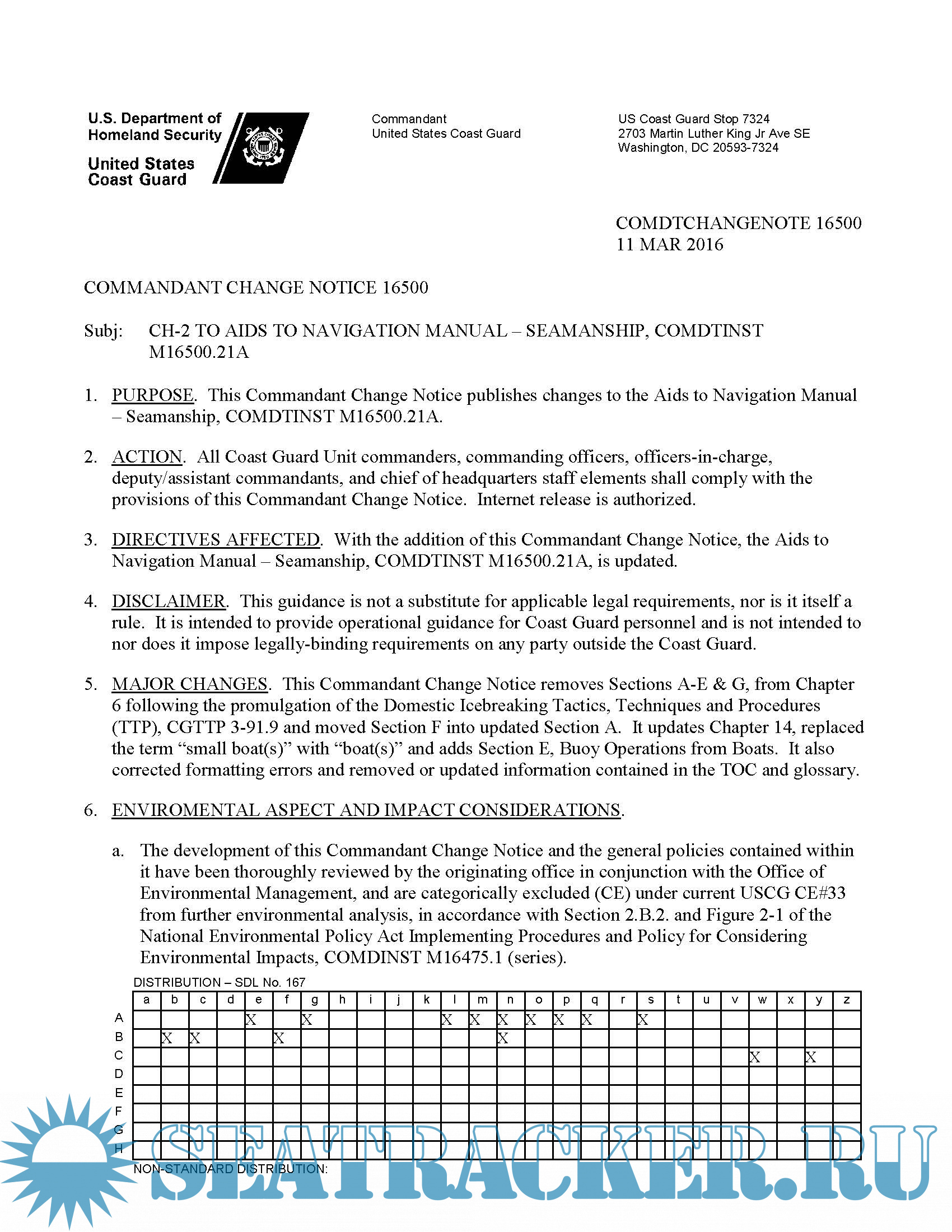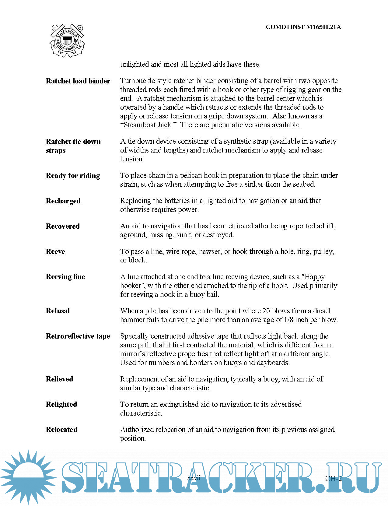 Description: This Manual replaces and updates the Aids to Navigation Manual – Seamanship. This Manual promulgates policy and guidance for seamanship practices for Coast Guard Aids to Navigation units and serves as a guide for wire rope practices throughout the Coast Guard.